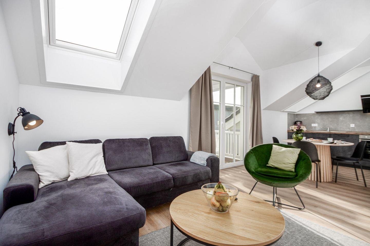 Das Wohnzimmer erwartet Sie mit einer einladenden Atmosphäre, komplett mit einer großzügigen Schlafcouch, die tagsüber zum gemütlichen Entspannen einlädt und sich nachts in ein komfortables Bett für zwei verwandelt. Ein Smart-TV und ein Sessel bieten beste Unterhaltung und Komfort.