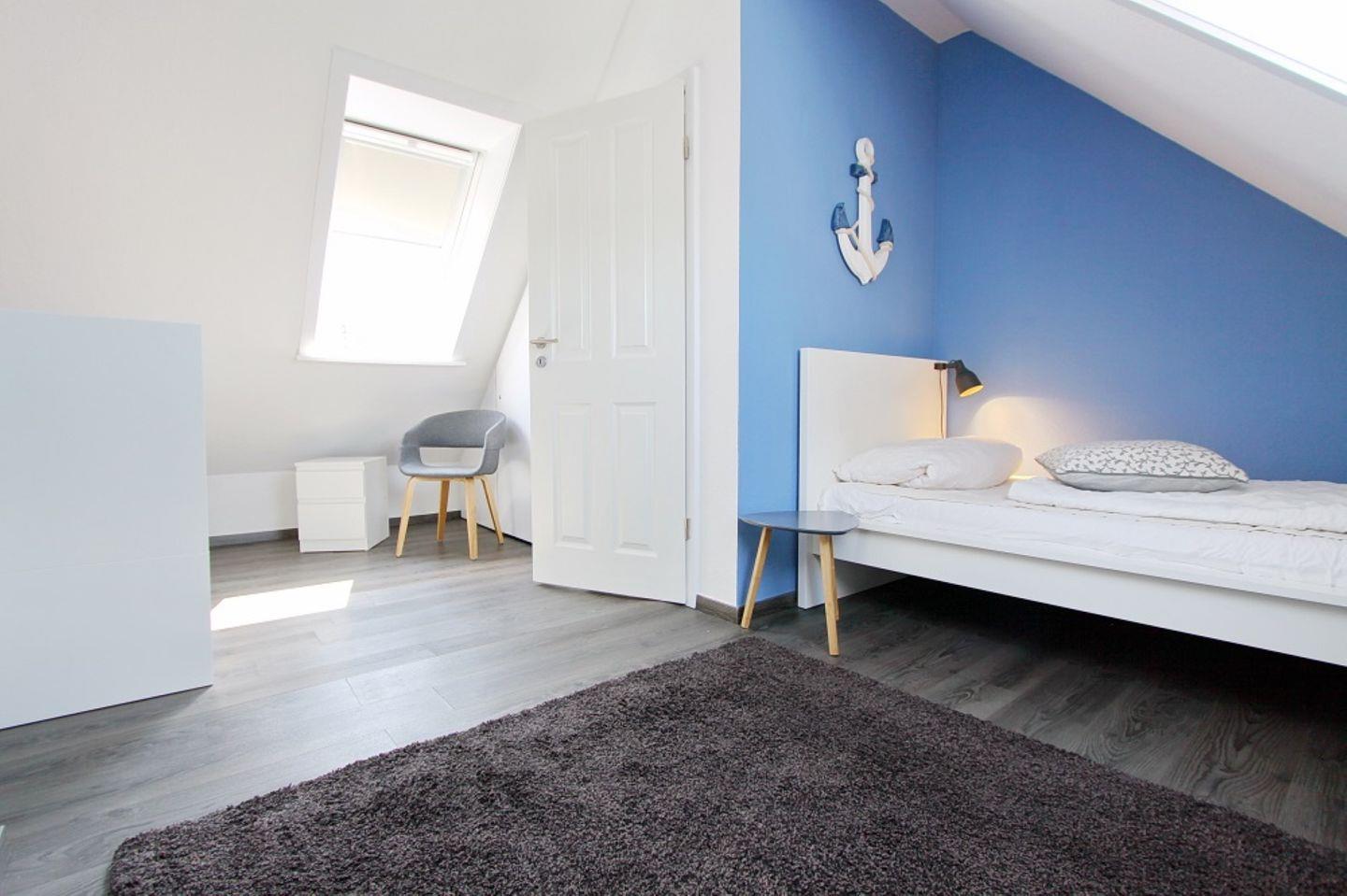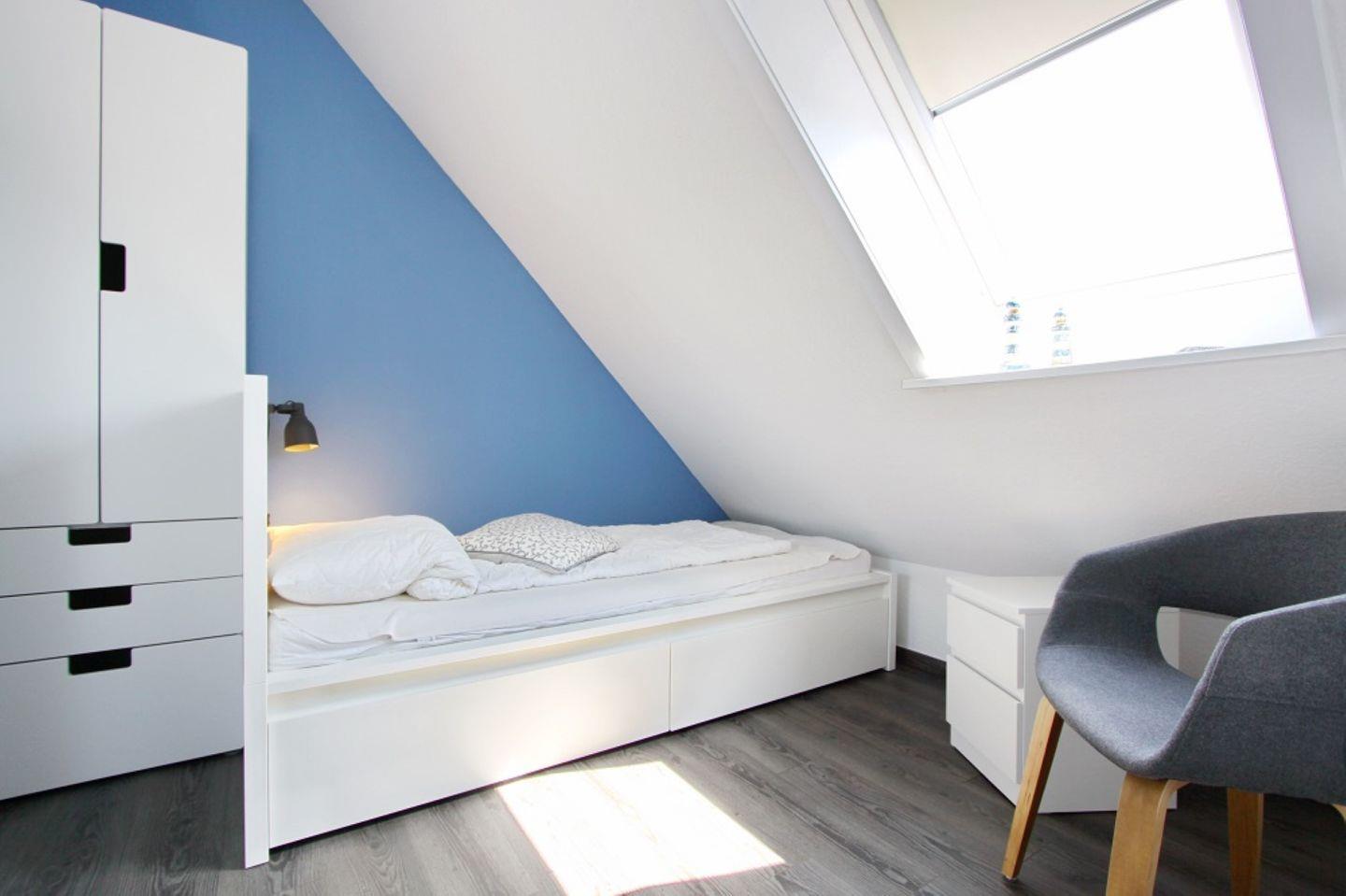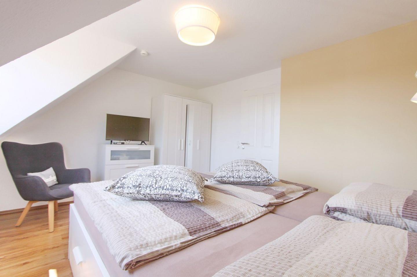 Im Dachgeschoss stehen zwei Einzelbetten und ein Kleiderschrank. Die Fenster haben Verdunkelungsrollos.