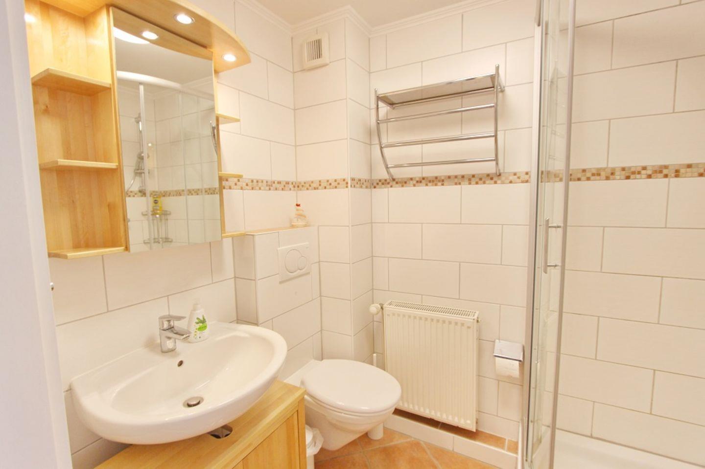 Das Duschbad mit WC, Waschbecken und Spiegelschrank befindet sich ebenfalls auf dieser Etage.