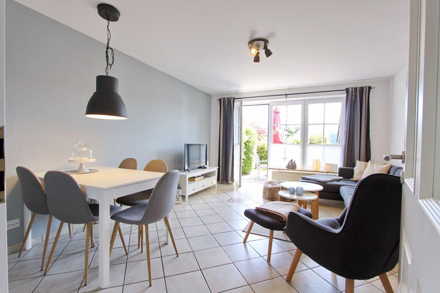 Der Wohnbereich verfügt über eine gemütliche Eckcouchgarnitur, Sessel, Flach TV, Stereoanlage mit Bluetooth und einen Essbereich für 6 Personen. Alle Fenster im Erdgeschoss lassen sich durch elektr. Außenrollläden verdunkeln.