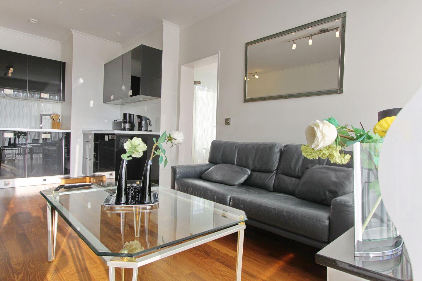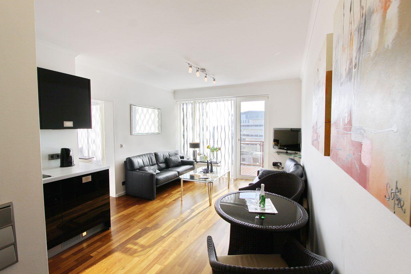 Mit einer großzügigen Fläche von 45 m² befindet sich die Wohnung im 3. Stock eines gepflegten Mehrfamilienhauses, das bequem mit einem Aufzug erreichbar ist. Der lichtdurchflutete Wohnbereich ist der ideale Ort, um nach einem langen Tag am Strand zu entspannen. Hier finden Sie eine komfortable Sofaecke sowie einen Essbereich, an dem Sie gemütliche Abende verbringen können. Die offene Küche ist mit allem ausgestattet, was das Herz begehrt: Spülmaschine, Induktionsherd, Kühlschrank und Kaffeemaschine stehen Ihnen zur Verfügung, damit Sie sich wie zu Hause fühlen.