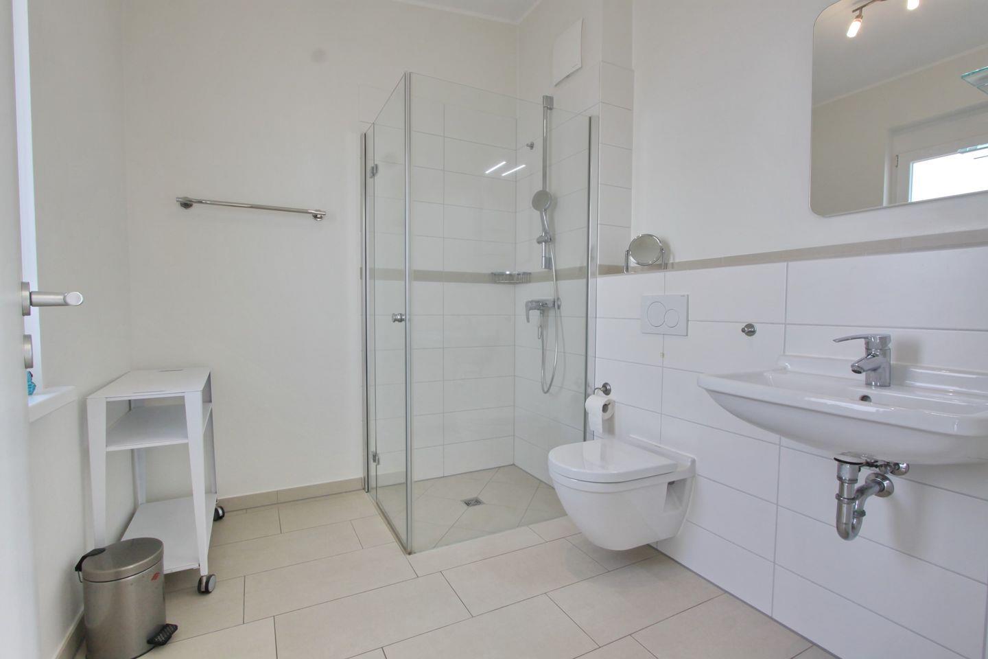 Das moderne und helle Duschbad mit WC hat ein Außenfenster. Es befindet sich ein geräumiger Einbauschrank im Flur sowie eine Waschmaschine für Sie zur Verfügung.