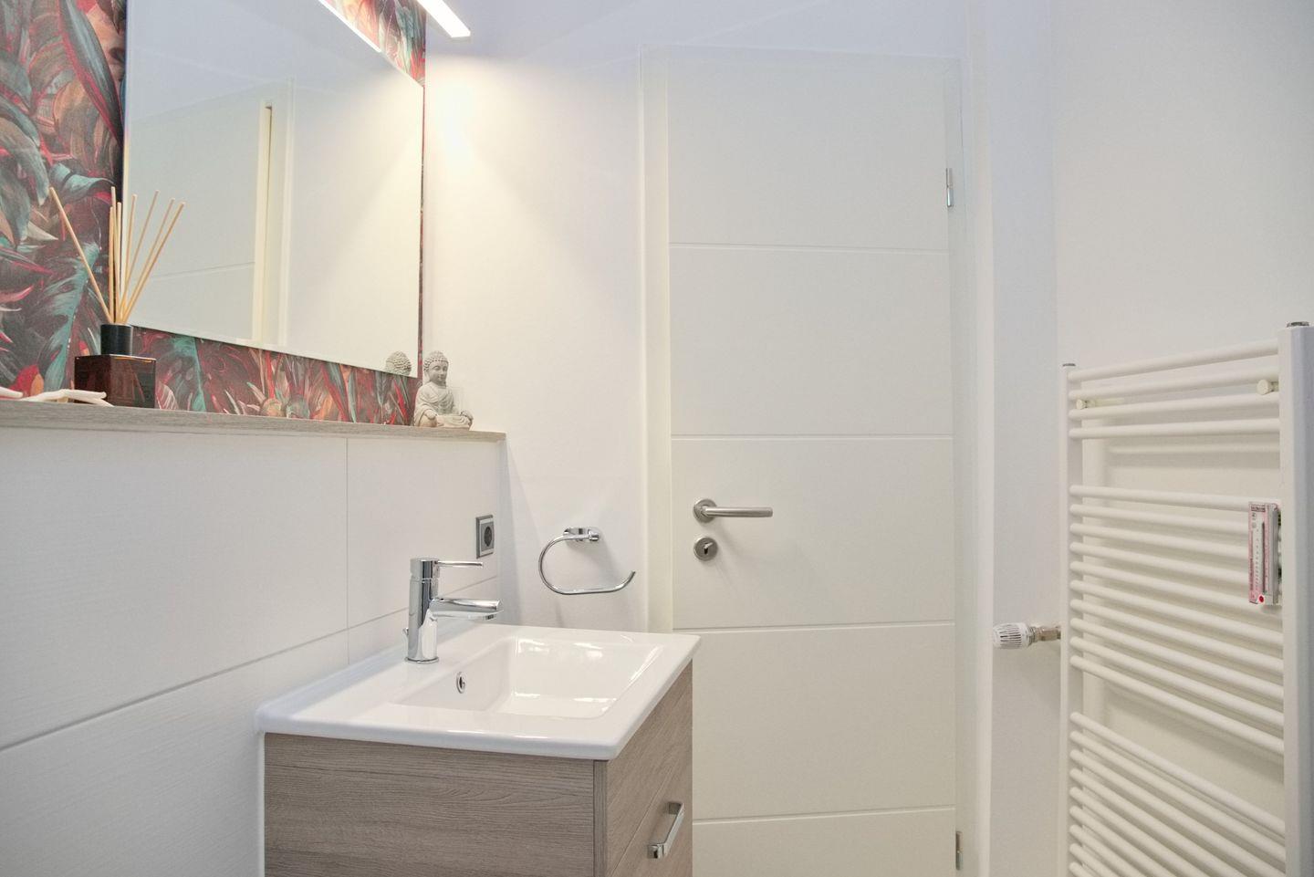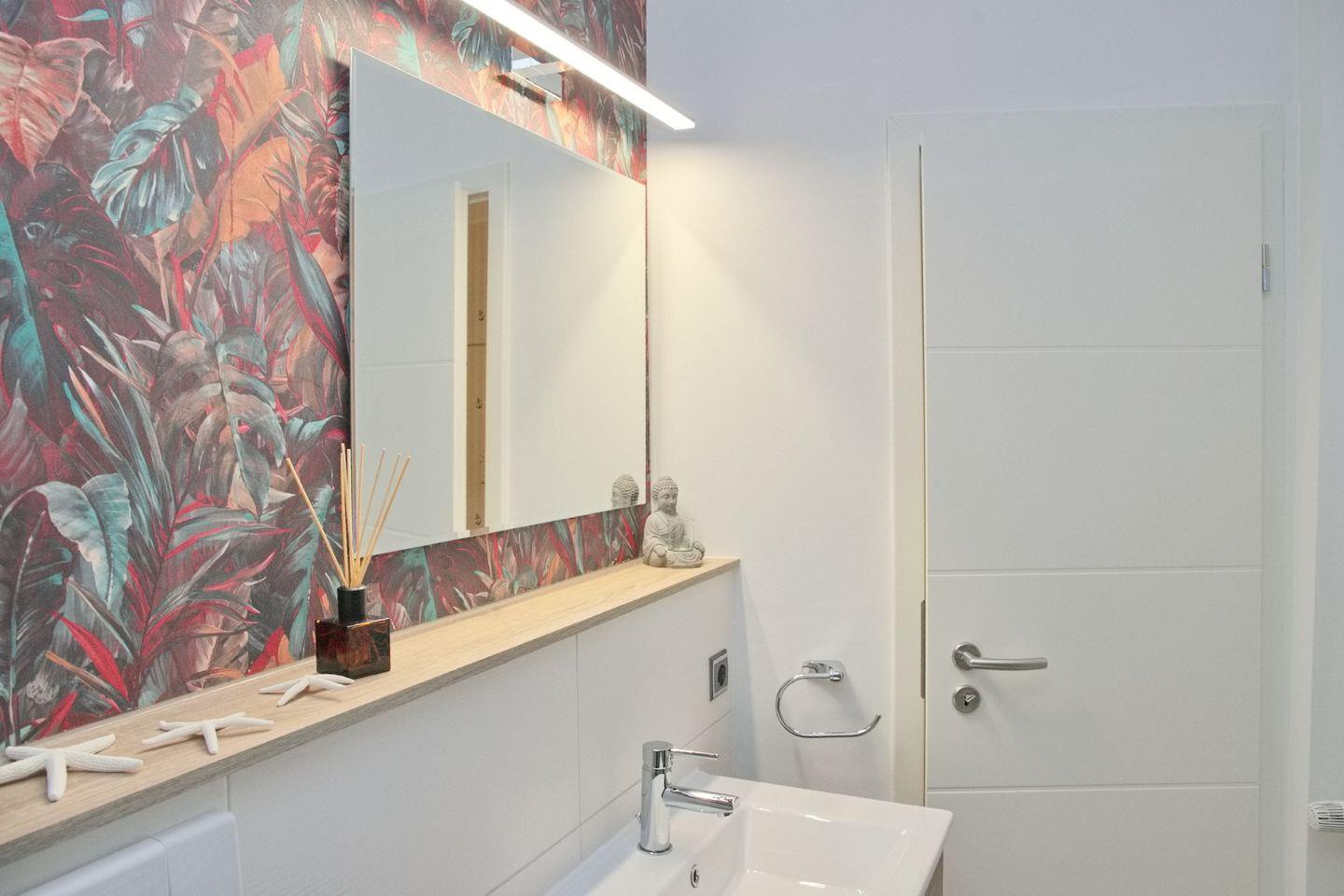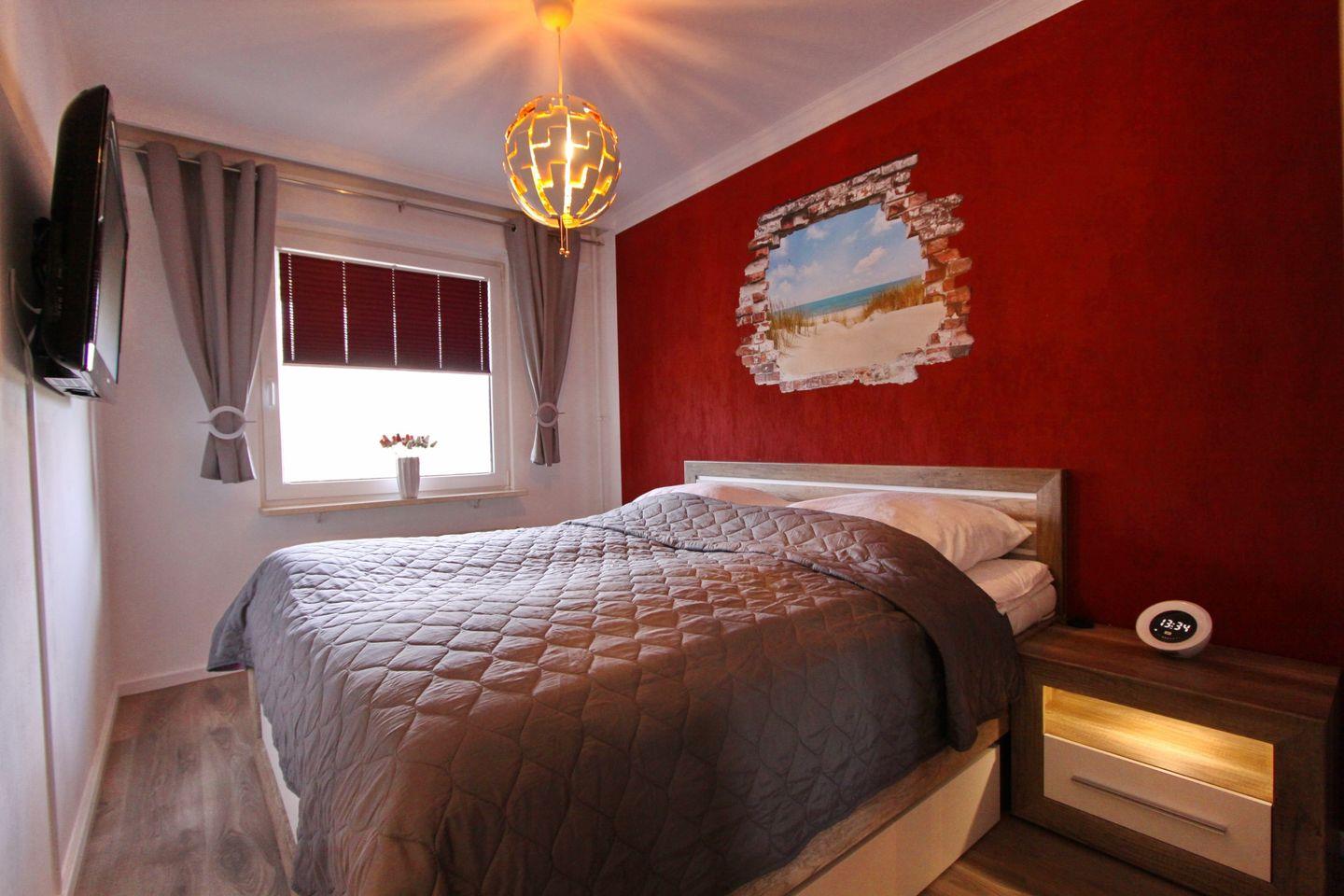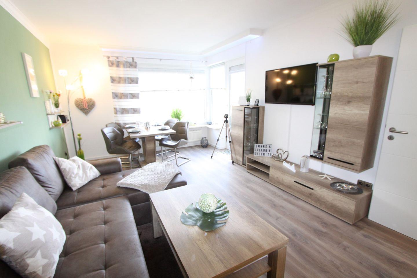 In der Wohnung angekommen erwartet Sie ein schmaler Flur mit Garderobe und Einbauschrank. Zu Ihrer rechten befindet sich das Duschbad mit WC, Waschtisch und beleuchteten Spiegel. Weiter kommen Sie in das separate Schlafzimmer. Hier erwartet Sie ein bequemes Doppelbett (2x90x200 cm), Nachttische und ein großer Kleiderschrank. Zurück auf den Flur geht es gerade aus weiter in den kombinierten Wohn- und Kochbereich. Der stylische Essbereich mit vier Stühlen hat seinen Platz vor der Fensterfront bekommen. Hier können Sie schon beim Frühstück den Blick Richtung Meer genießen. Die Eckschlafcouch lädt zum geselligen Beisammen sein ein. Ein Flachbild TV und eine Stereoanlage mit CD Player stehen zur Unterhaltung bereit. Die angrenzende offen gestaltete Einbauküche verfügt unter anderem über ein Cerankochfeld, Backofen, Geschirrspülmaschine, Kühlschrank mit Gefrierfach und weitere kleine nützliche Küchenhelfer.