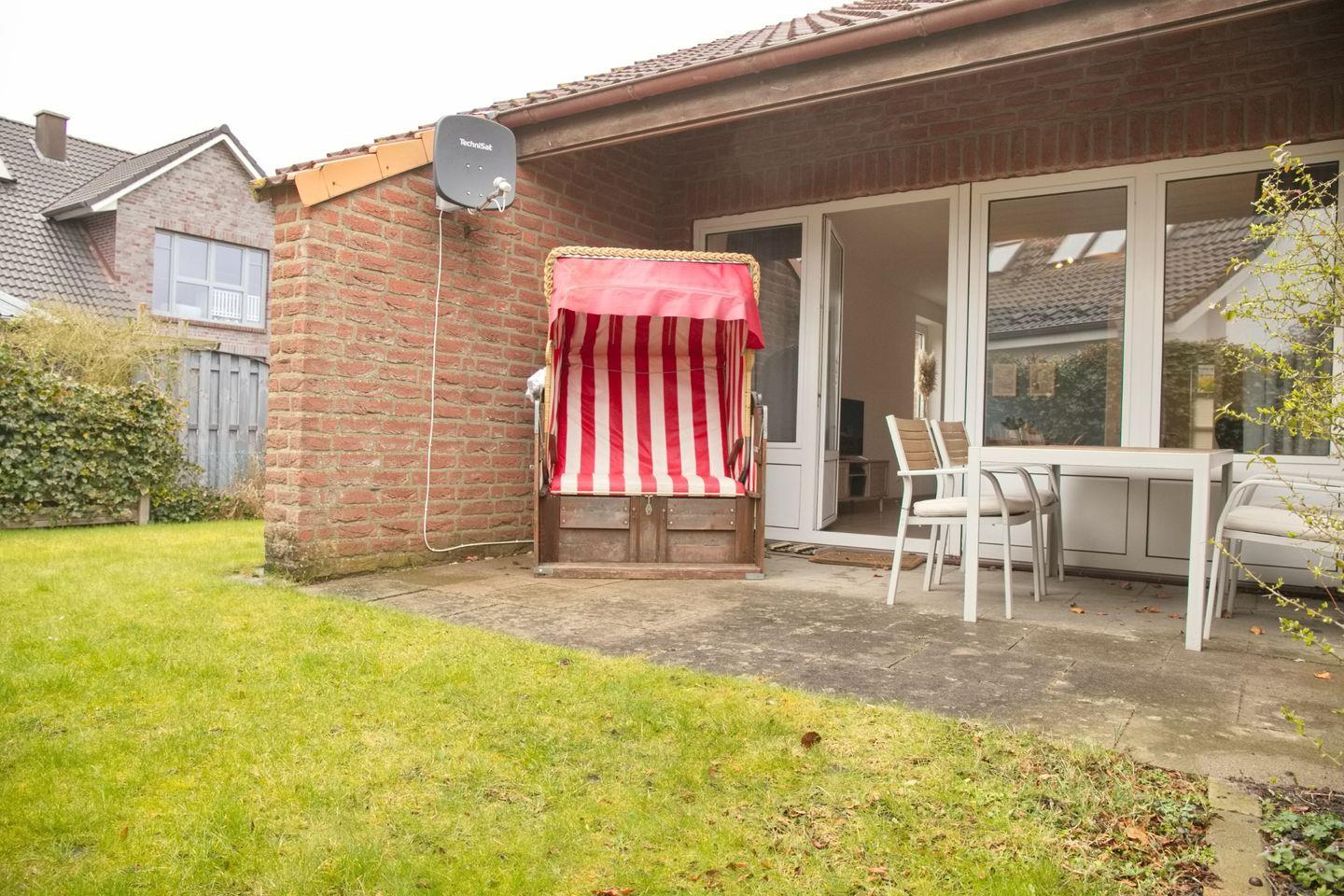 Außerhalb des Hauses gibt es eine Terrasse mit Gartenmöbeln, die perfekt für Mahlzeiten im Freien oder einfach zum Entspannen in der Sonne ist. Der Garten ist gepflegt und bietet viel Platz zum Spielen und Toben für Kinder, die Eltern machen es sich derweil im eigenen Strandkorb auf der Terrasse gemütlich.