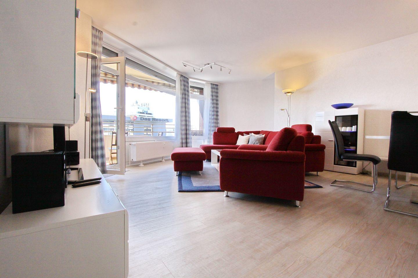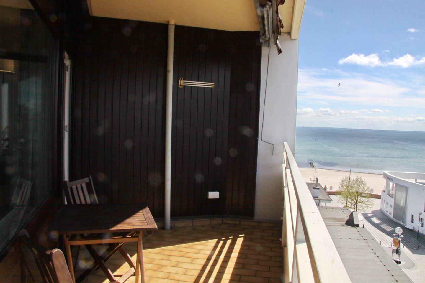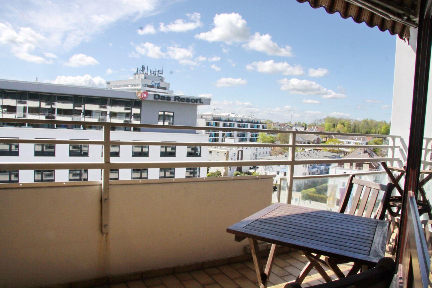 Diese moderne Ferienwohnung befindet sich in der 7. Etage mit möbliertem Süd-/ Westbalkon und Teilseeblick auf die Lübecker Bucht.