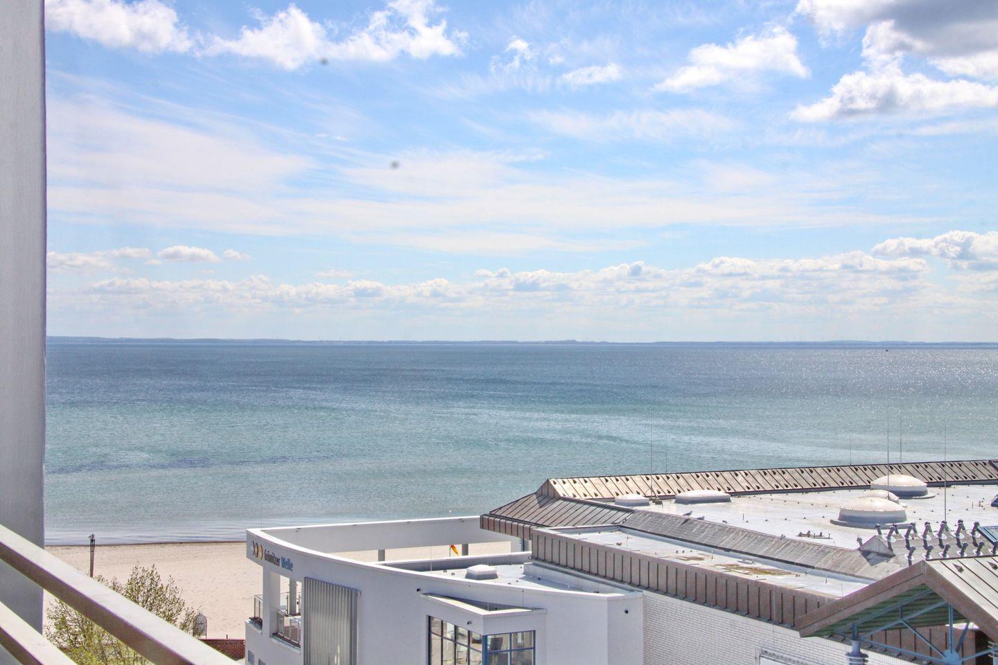 Moderne Ferienwohnung mit möblierten Süd-/ Westbalkon und Teilseeblick auf die Ostsee, im Herzen von Grömitz, direkt an der Seebrücke gelegen.