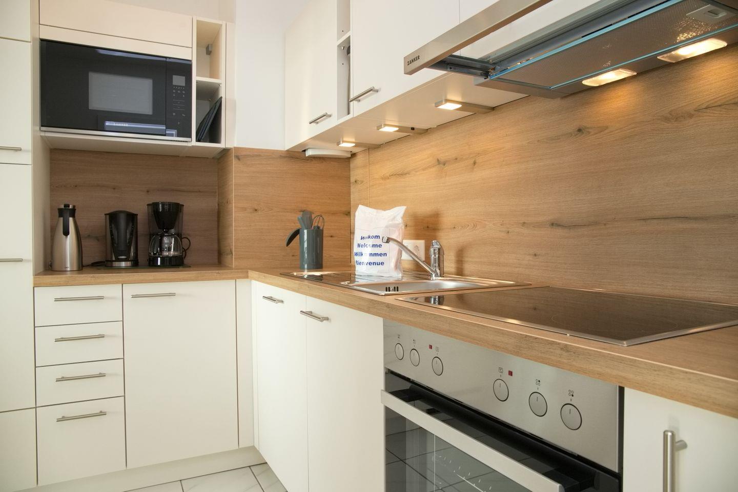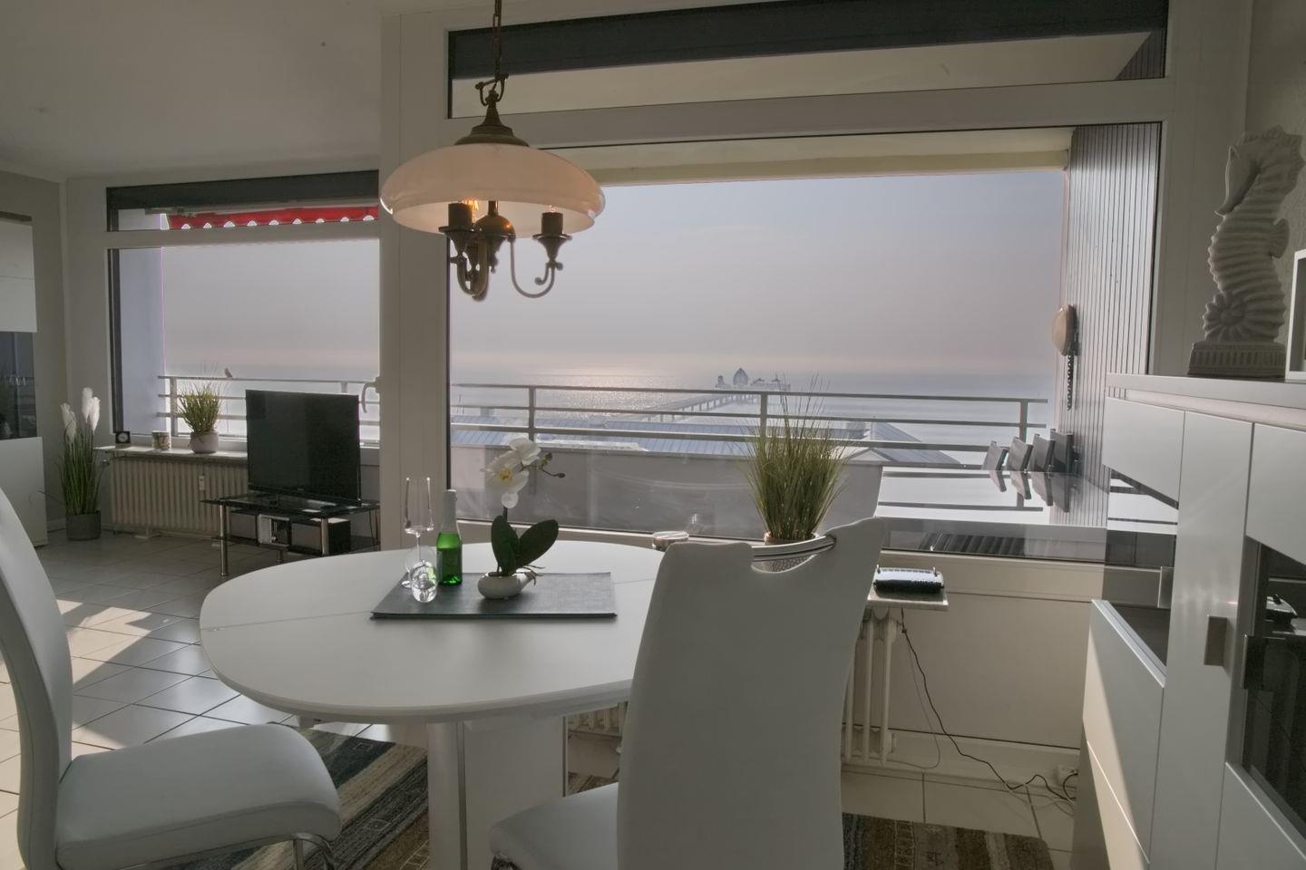 Der moderne Ess- und Wohnbereich ist dank der großen Fensterfronten hell und freundlich. Genießen Sie die Aussicht auf die Seebrücke auch an regnerischen Tagen. Die harmonisch integrierte Küche ist mit einem Kühlschrank mit Gefrierfach, einem 4-Zonen-Cerankochfeld, einem Backofen, einer Geschirrspülmaschine, einer Mikrowelle, Wasserkocher, Toaster und diversem Kleininventar ausgestattet.