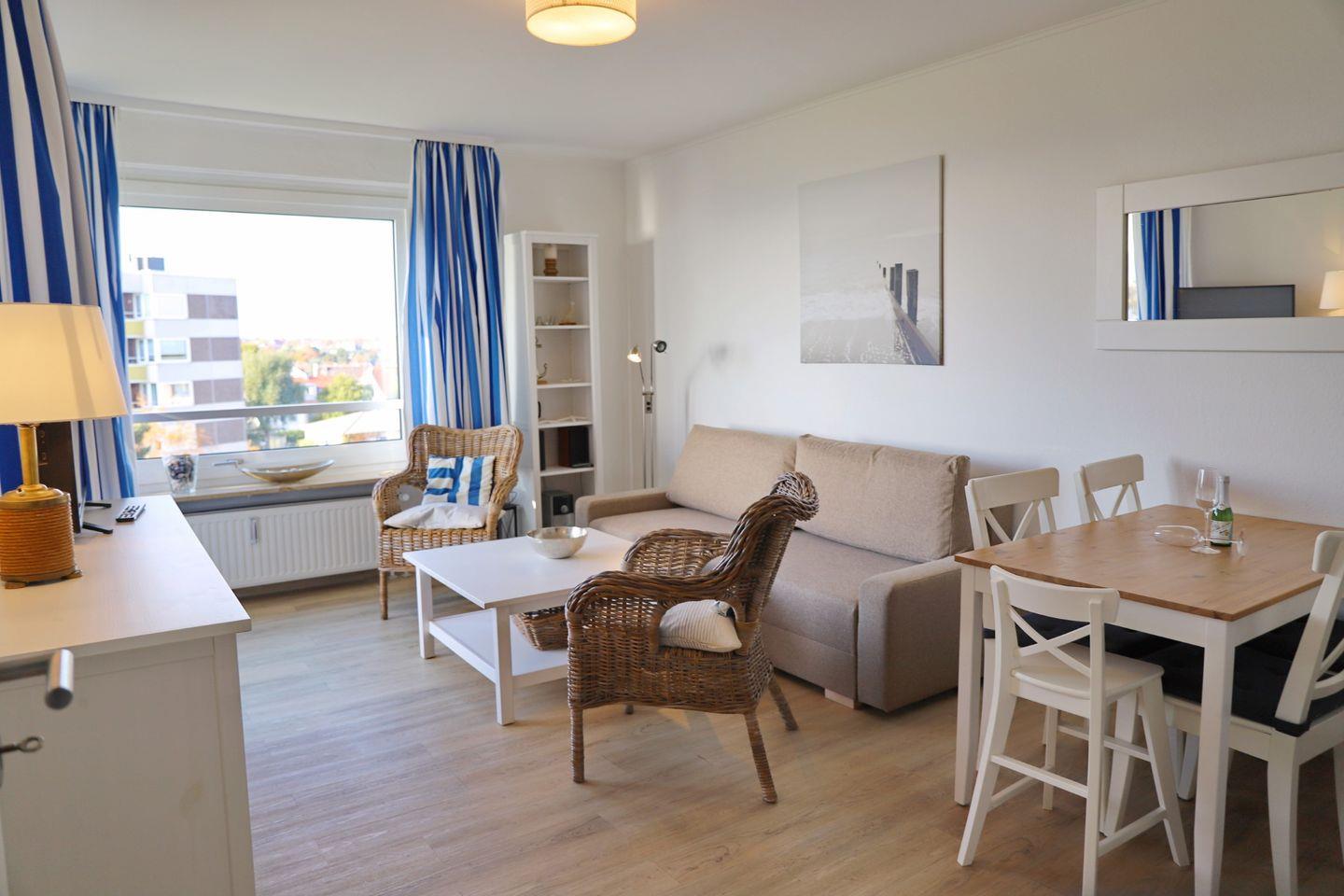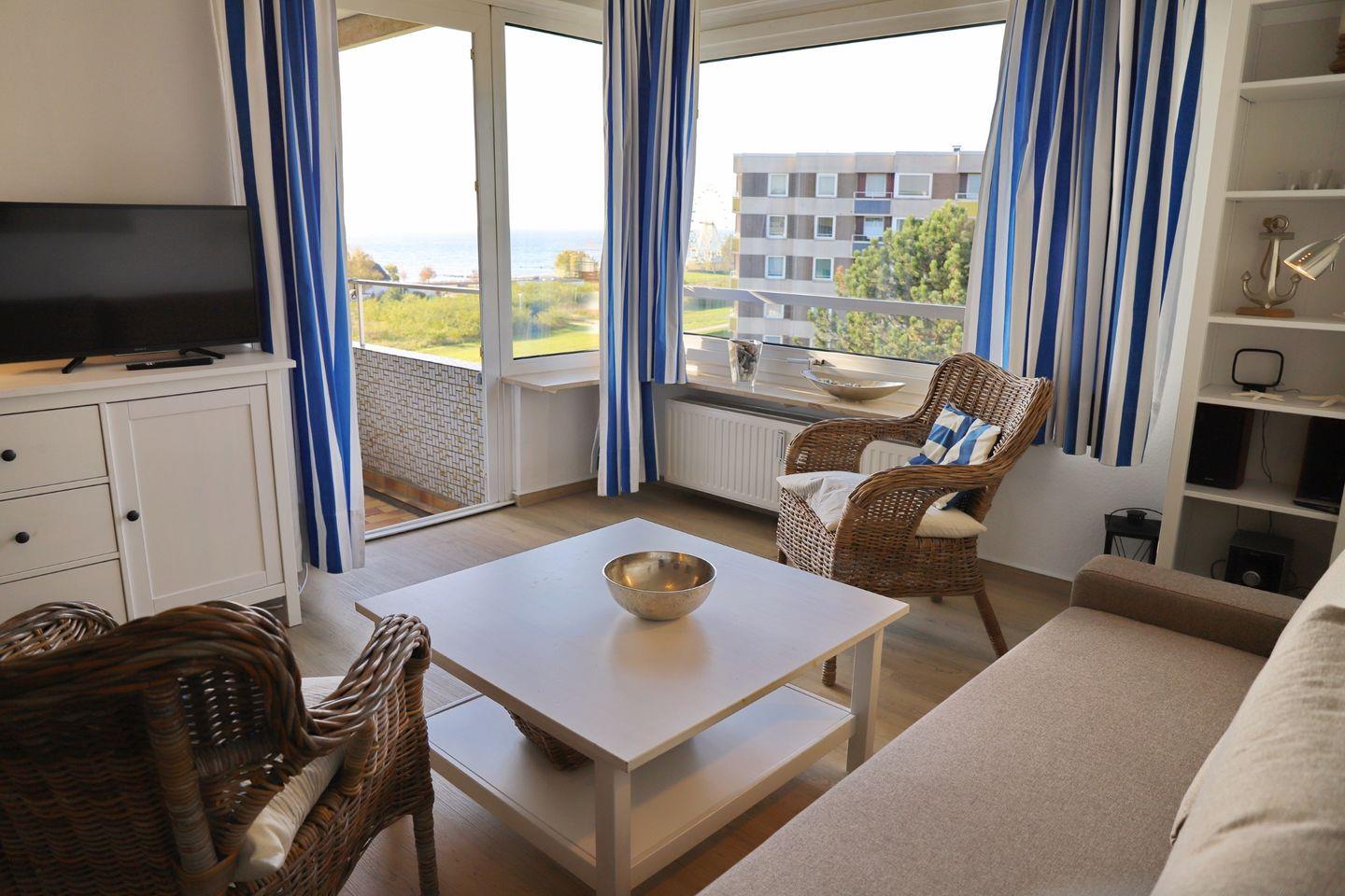 Schöne 2 Zimmer Eckwohnung direkt hinter dem Deich mit möbliertem Süd-/ Westbalkon und Blick über die Lübecker Bucht. Nur wenige Meter zum Meer.