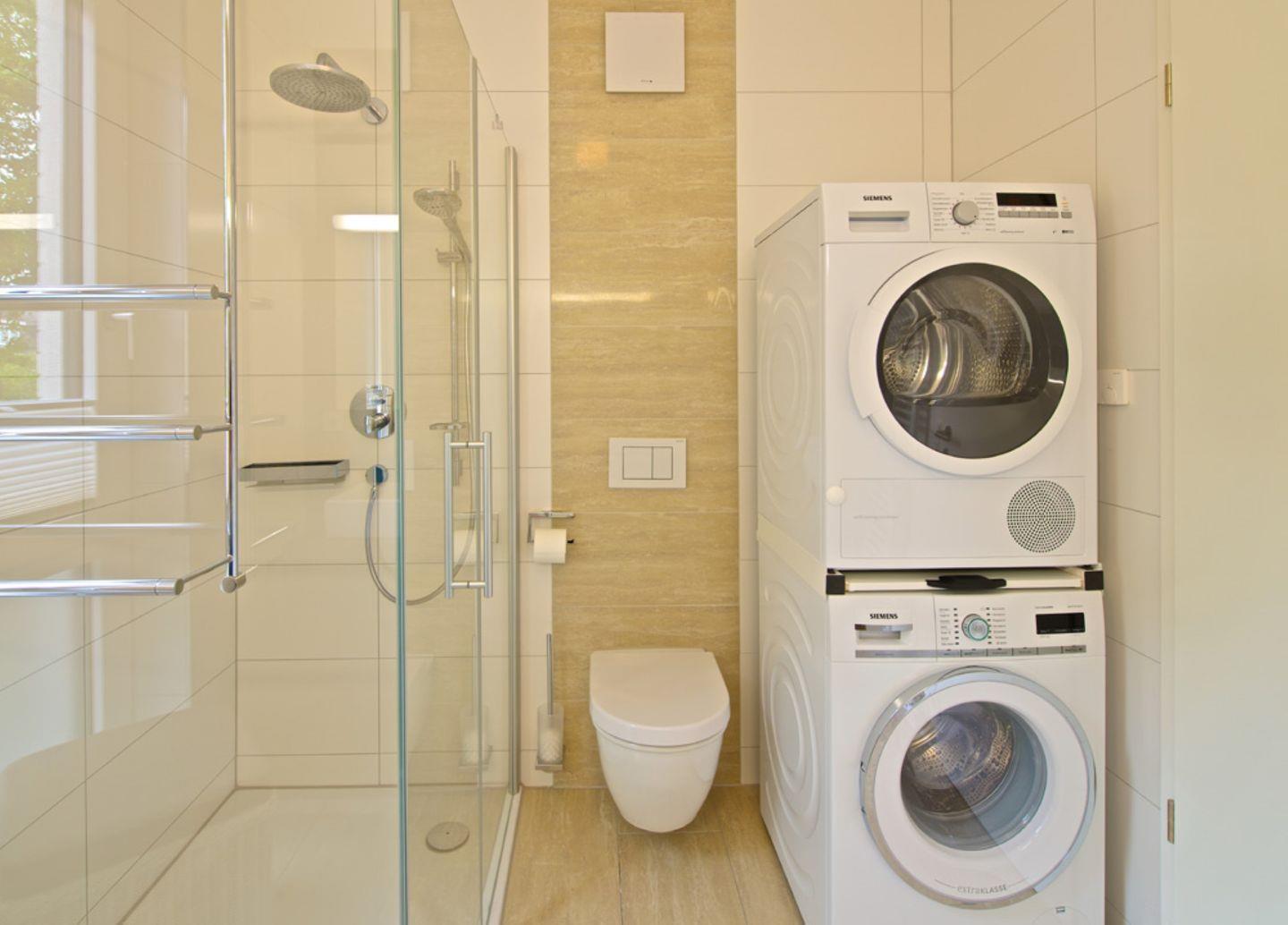 Das moderne Tageslichtbad verfügt über einen Doppelwaschtisch mit integrierten Schubladen, einem großen beleuchteten Spiegelschrank, einer geräumigen ebenerdigen Dusche, einem Handtuchheizkörper und einem WC. Eine Waschmaschine und Trockner stehen Ihnen kostenlos zur Verfügung. Ein separates WC mit einem weiteren Handtuchheizkörper steht Ihnen zur Verfügung.