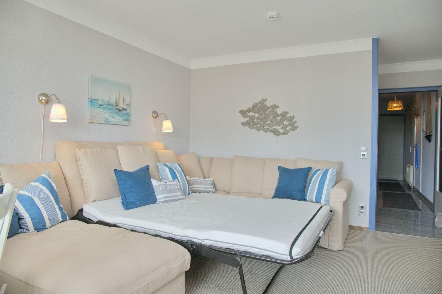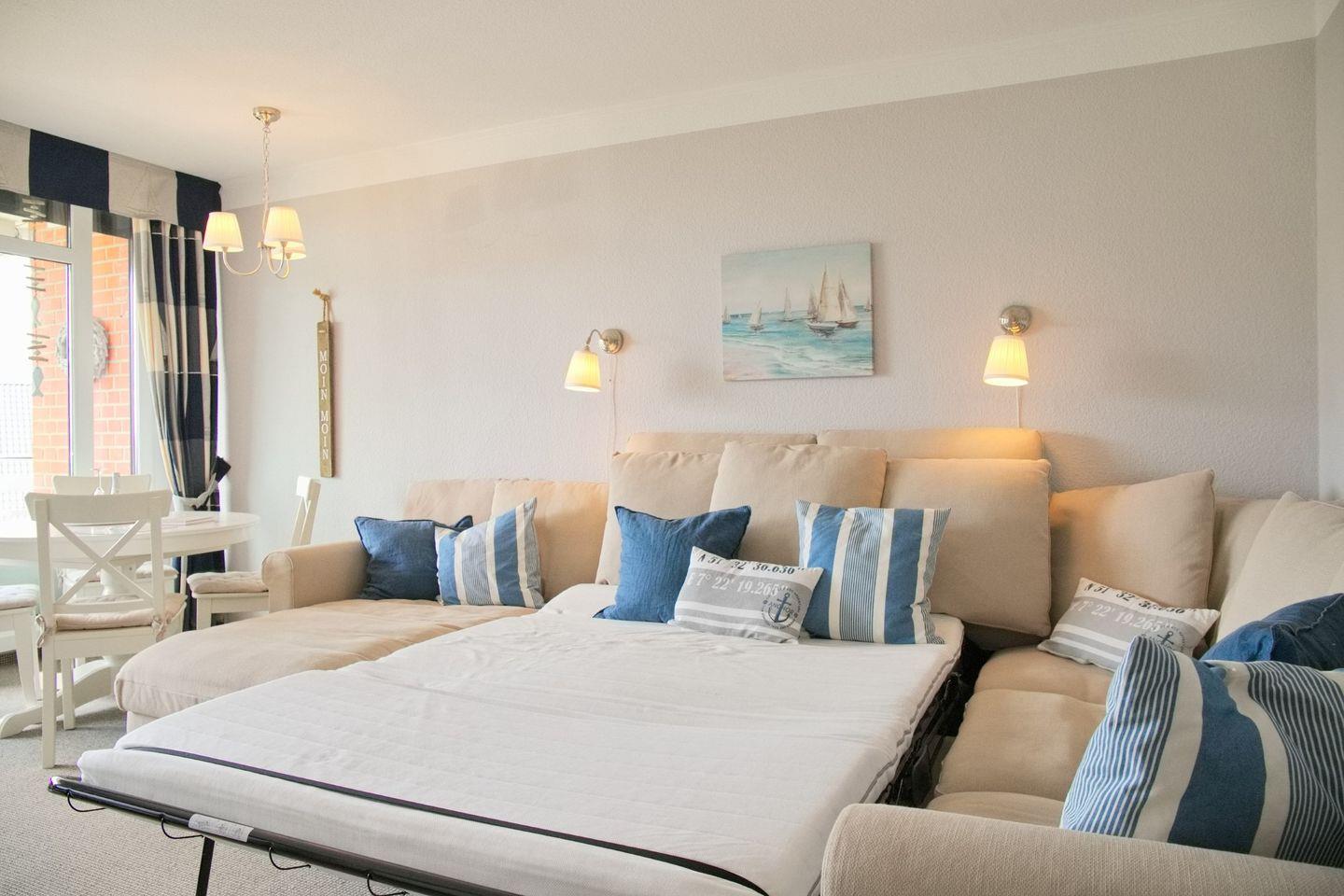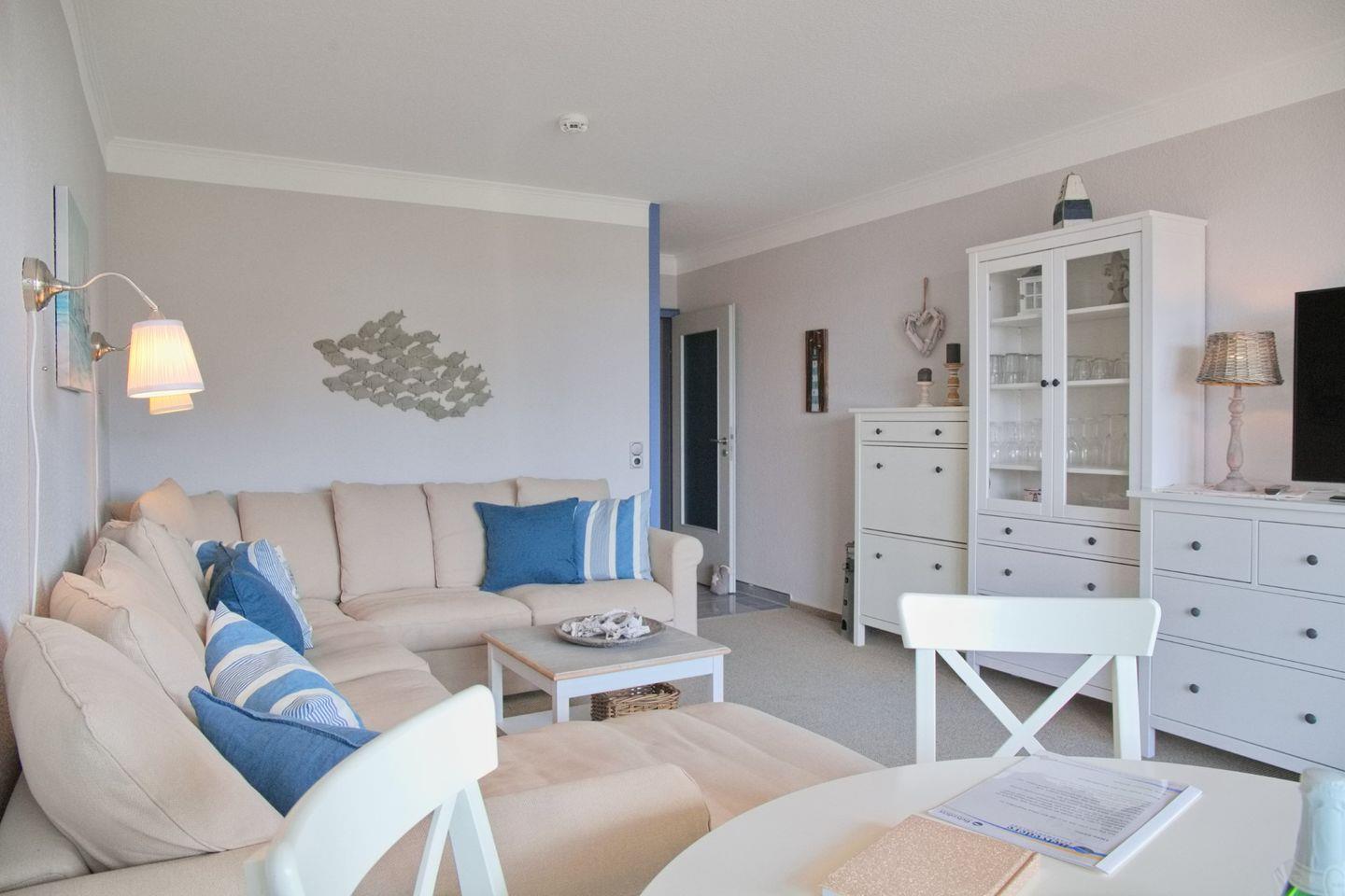 Willkommen in dieser gemütlichen 2-Zimmer-Wohnung in der 3. Etage, die ideal für bis zu 4 Erwachsene und maximal 2 Hunde geeignet ist. Diese Ferienwohnung bietet Ihnen nicht nur einen möblierten Balkon mit Markise und tollem seitlichen Meerblick, sondern auch alle Annehmlichkeiten, die Sie für einen erholsamen Urlaub benötigen. Das großzügige Wohnzimmer lädt mit einer großen Wohnlandschaft mit integrierter Schlaffunktion (Liegefläche 140x200 cm), einem Flachbild-TV und einer Kommode zum Entspannen ein. In der angrenzenden Essecke finden 4 Personen bequem Platz für gemeinsame Mahlzeiten und gesellige Stunden.