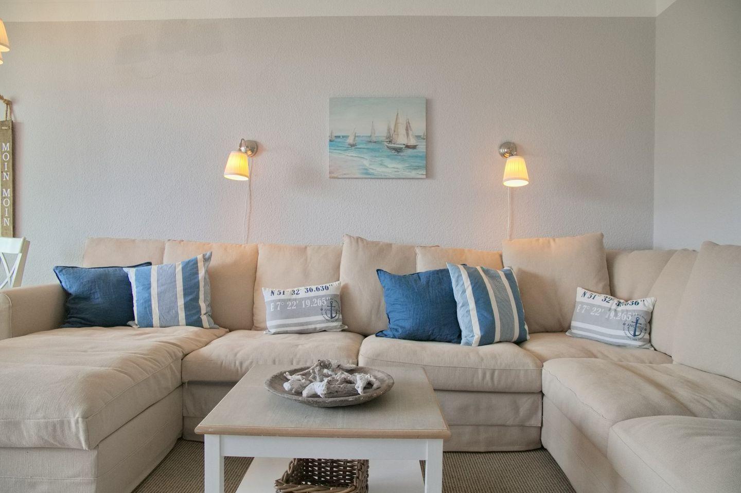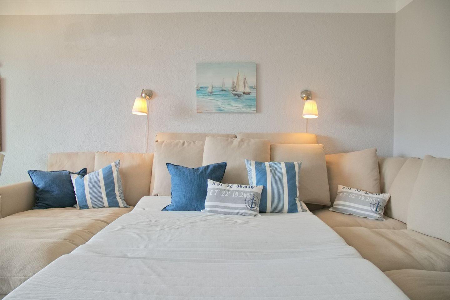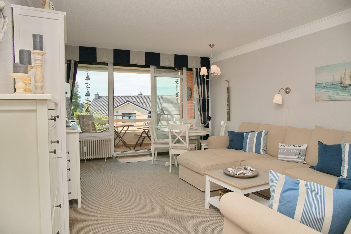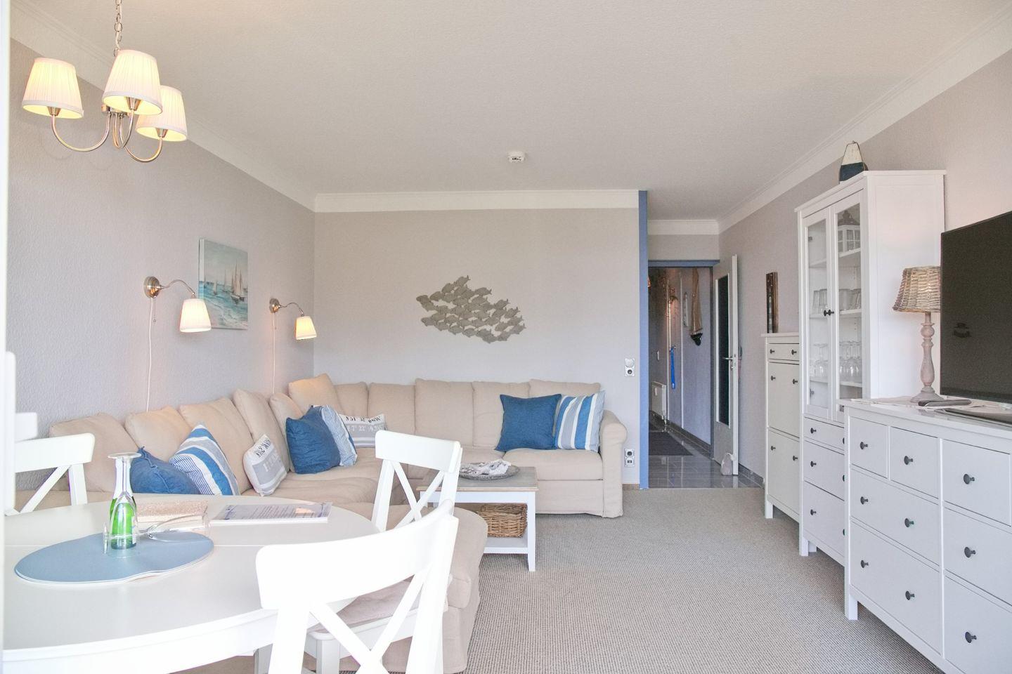 Willkommen in dieser gemütlichen 2-Zimmer-Wohnung in der 3. Etage, die ideal für bis zu 4 Erwachsene und maximal 2 Hunde geeignet ist. Diese Ferienwohnung bietet Ihnen nicht nur einen möblierten Balkon mit Markise und tollem seitlichen Meerblick, sondern auch alle Annehmlichkeiten, die Sie für einen erholsamen Urlaub benötigen. Das großzügige Wohnzimmer lädt mit einer großen Wohnlandschaft mit integrierter Schlaffunktion (Liegefläche 140x200 cm), einem Flachbild-TV und einer Kommode zum Entspannen ein. In der angrenzenden Essecke finden 4 Personen bequem Platz für gemeinsame Mahlzeiten und gesellige Stunden.