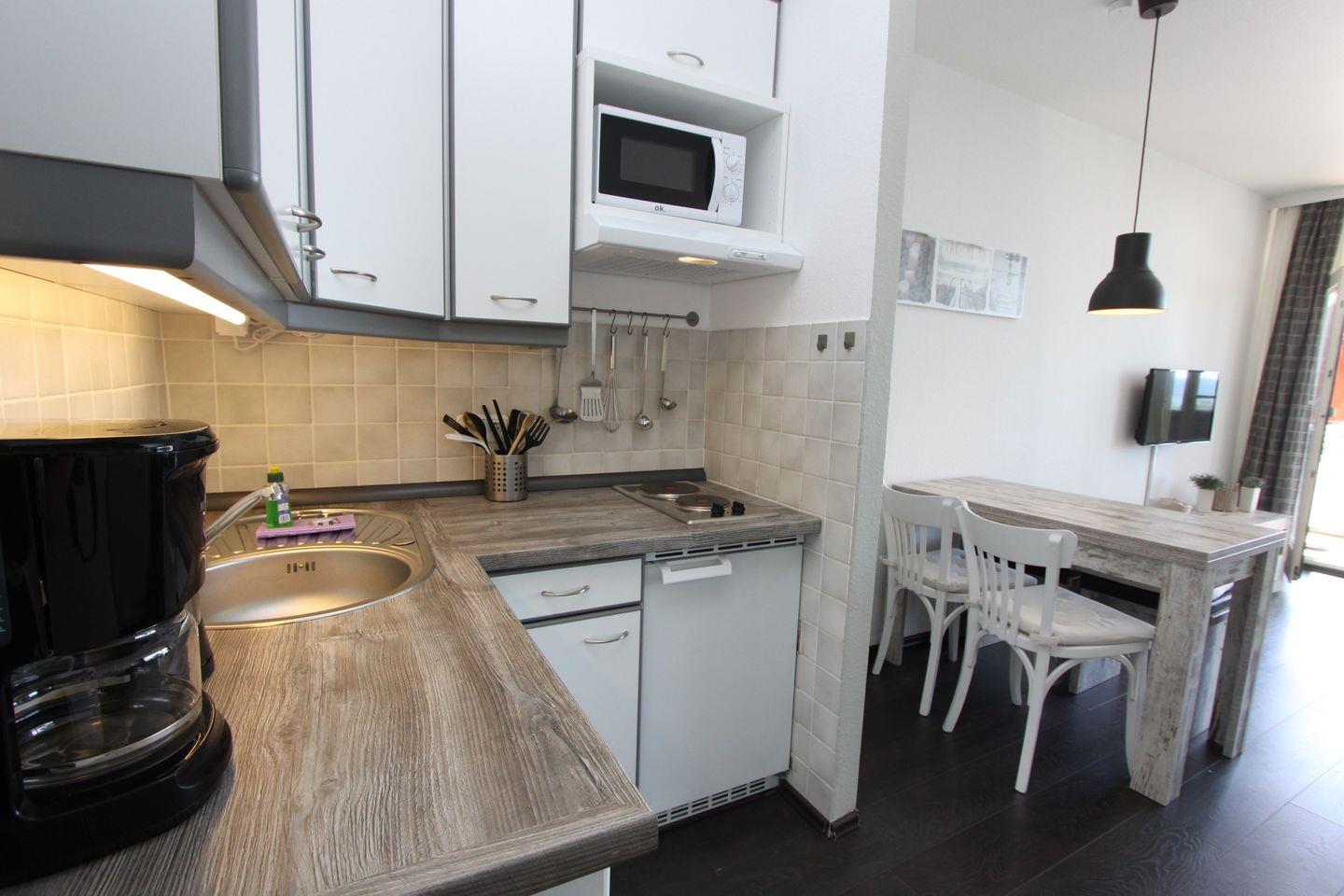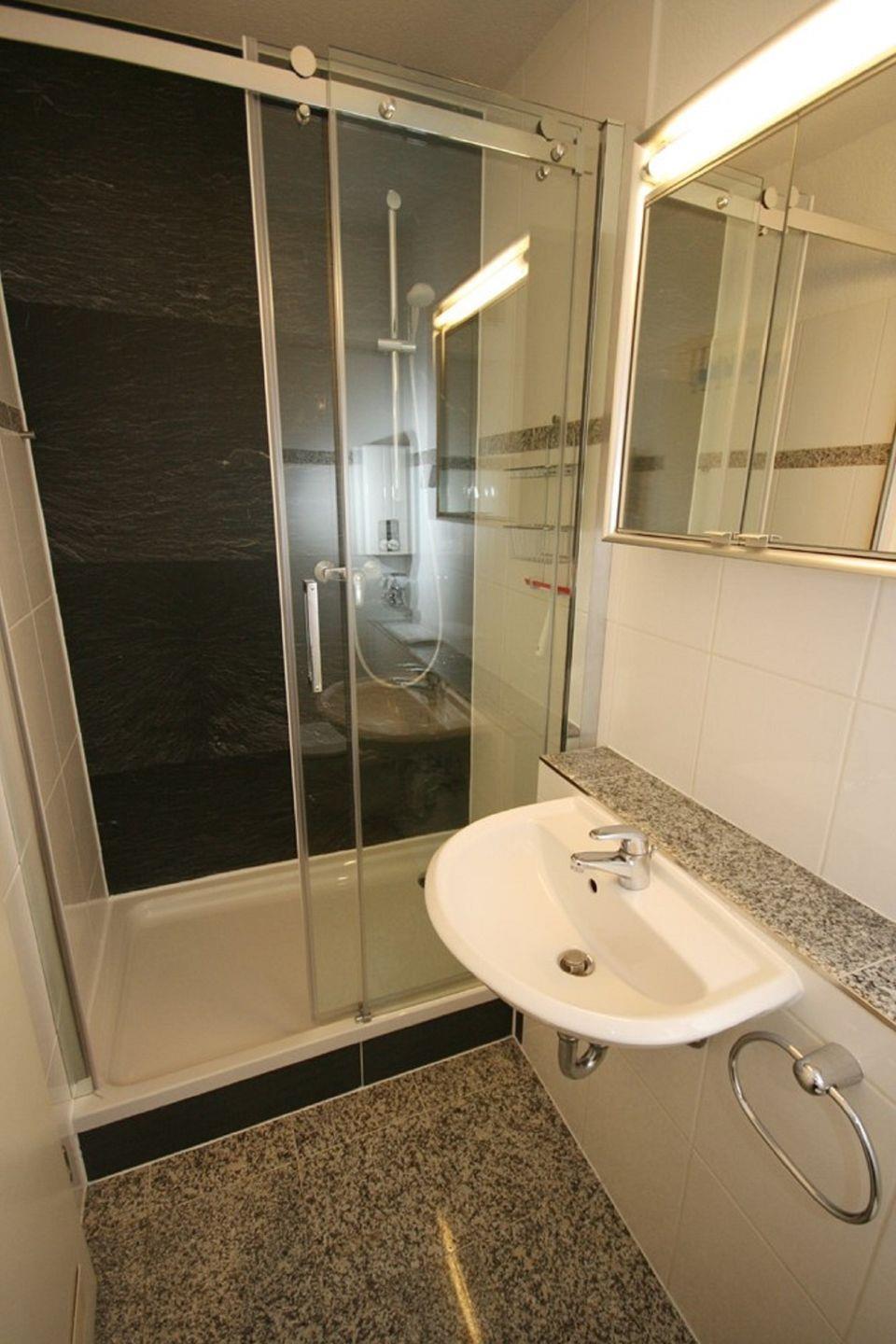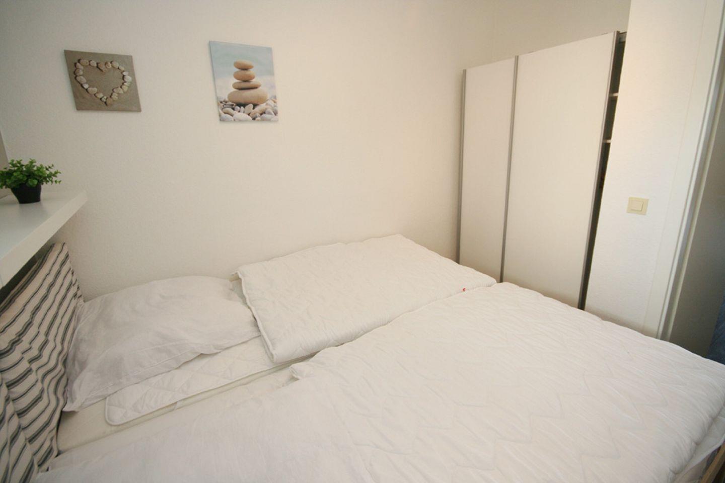 Die kleine Pantryküche ist ausgestattet mit einem 2- Plattenherd, einem Geschirrspüler, einer Mikrowelle, einem Kühlschrank mit Gefrierfach, einem Wasserkocher, einem Toaster und einer Kaffeemaschine. Im separaten Schlafzimmer stehen 2 Einzelbetten, die sich leicht zusammen schieben lassen. Das neue Duschbad ist mit hochwertigen Granitfußboden ausgelegt, sowie einer geräumigen schönen Dusche, ein Waschbecken und ein Hänge-WC. Die Wohnung ist mit einem Designerboden ausgelegt.