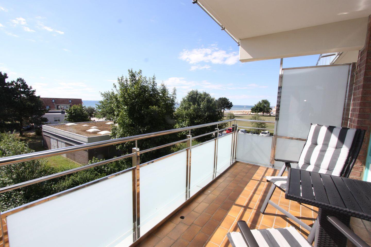 Helle freundliche Ferienwohnung mit möblierten Südbalkon und herrlichen Blick auf die See, direkt an der Promenade, im Herzen von Grömitz.