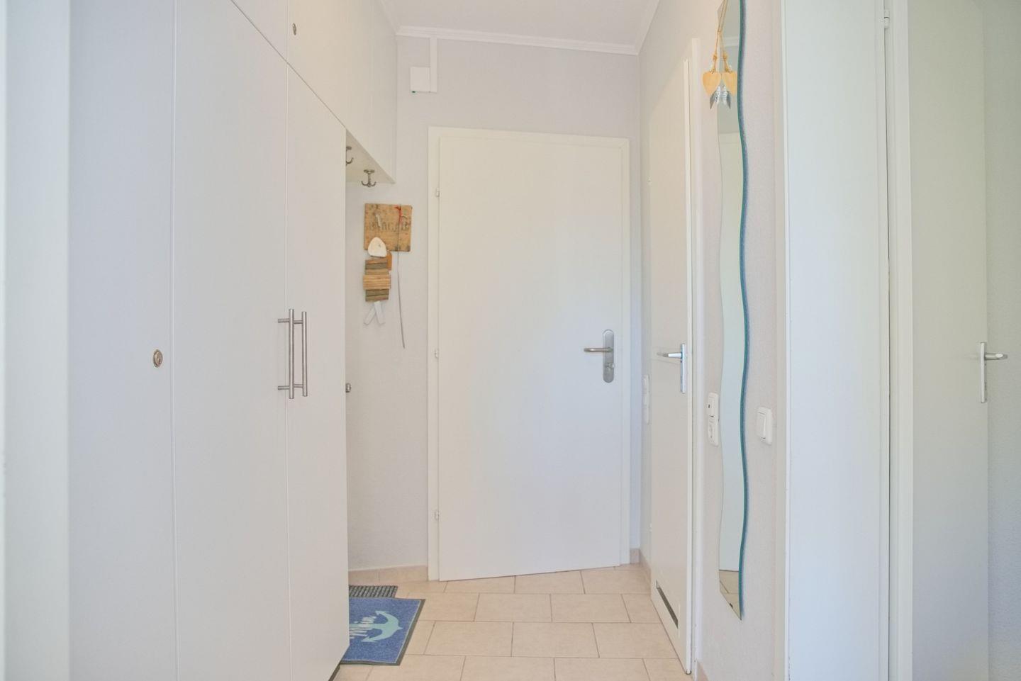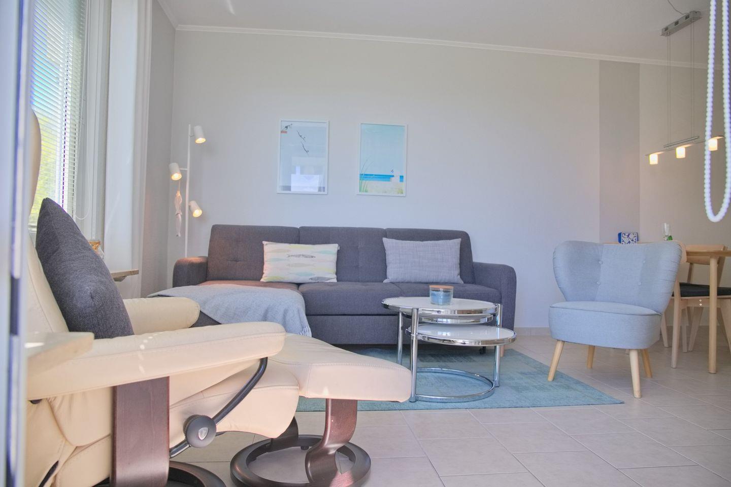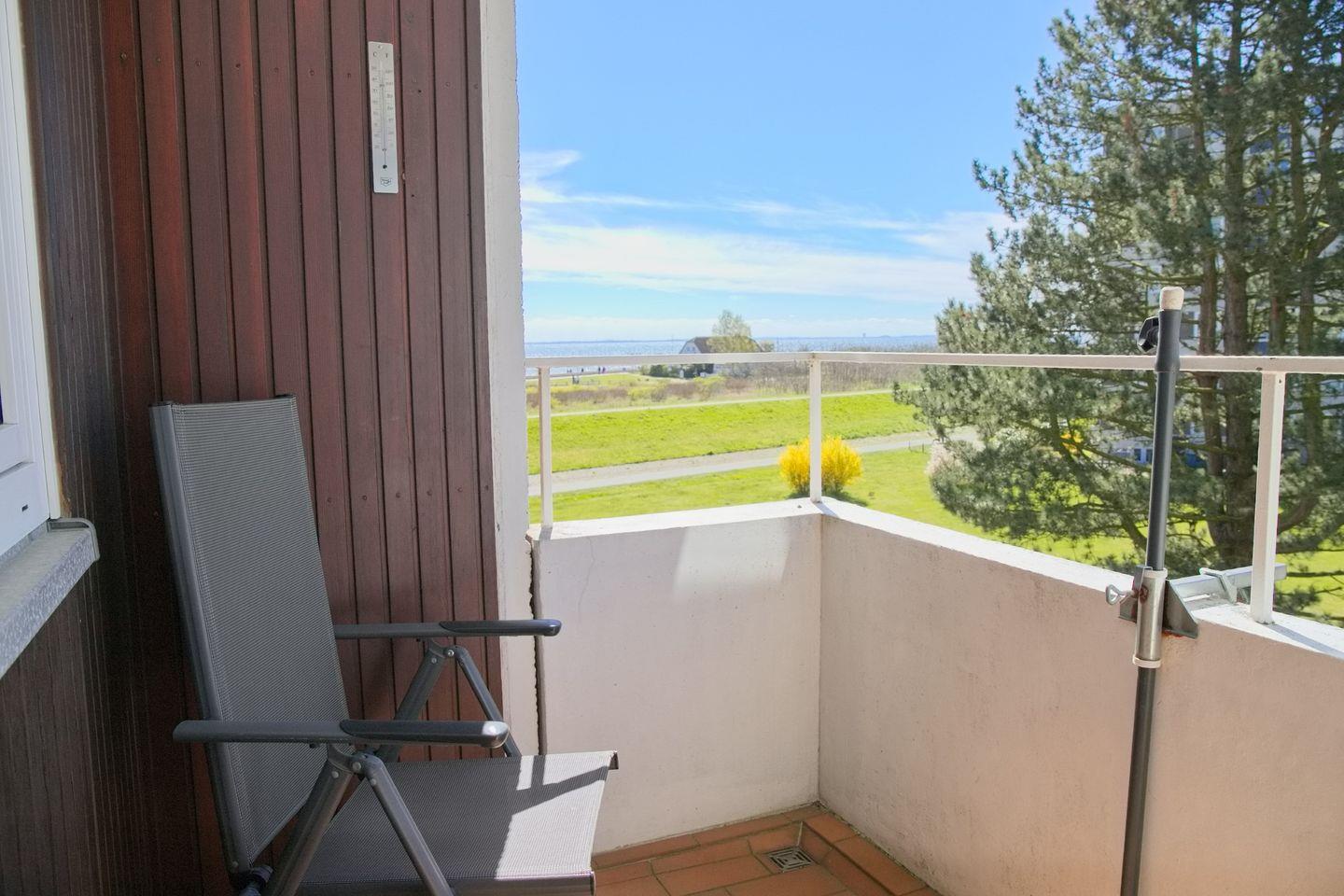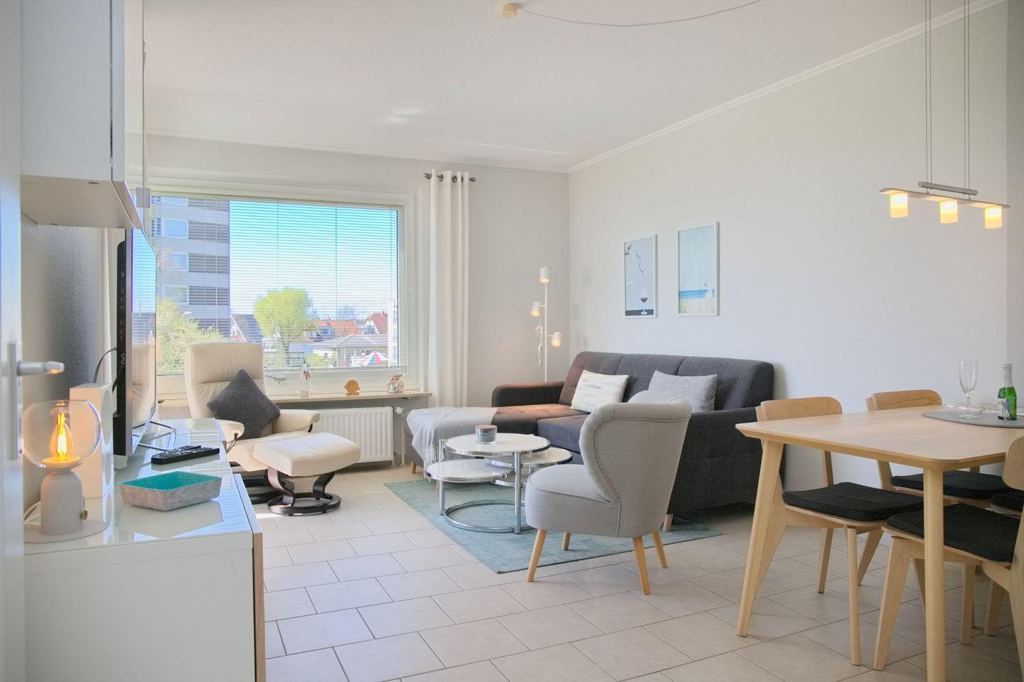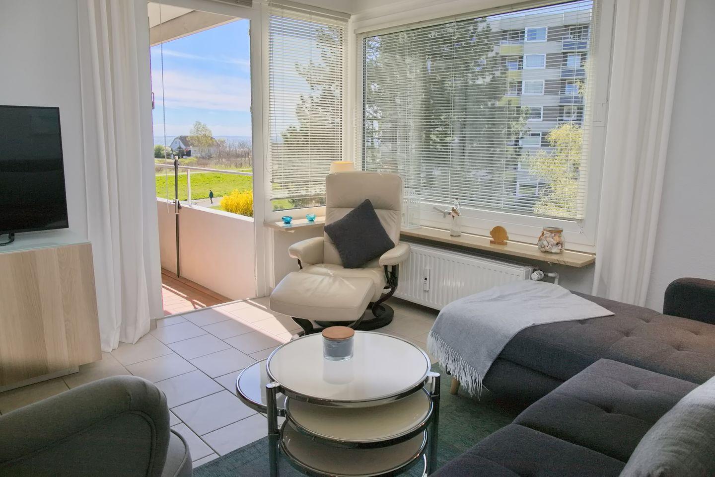 Sehr schöne 2-Zimmer-Wohnung (ca. 43 qm) für 4 Personen in der 2. Etage mit möblierten Balkon und Seeblick in Westlage. Das Wohnzimmer ist mit einem Sofa mit Schlaffunktion (Liegefläche 120 x 200 cm), einem Stressless Sessel mit Hocker, einen Flach-TV, einer Stereoanlage sowie einem Essbereich mit 4 Stühlen ausgestattet. Die offene Einbauküche verfügt über einen Geschirrspüler, einem Cerankochfeld, einem Backofen, einer Mikrowelle, ein Kühlschrank mit Gefrierfach, eine Kaffeemaschine, einer Nespresso Kapselmaschine, einem Toaster und Wasserkocher. Im Schlafzimmer stehen ein Doppelboxspringbett (durchgehender Topper, 180x200 cm), ein Flach-TV und ein Kleiderschrank zur Verfügung. Freundliches helles Duschbad mit Rainshower, WC, Waschtisch und Fön.