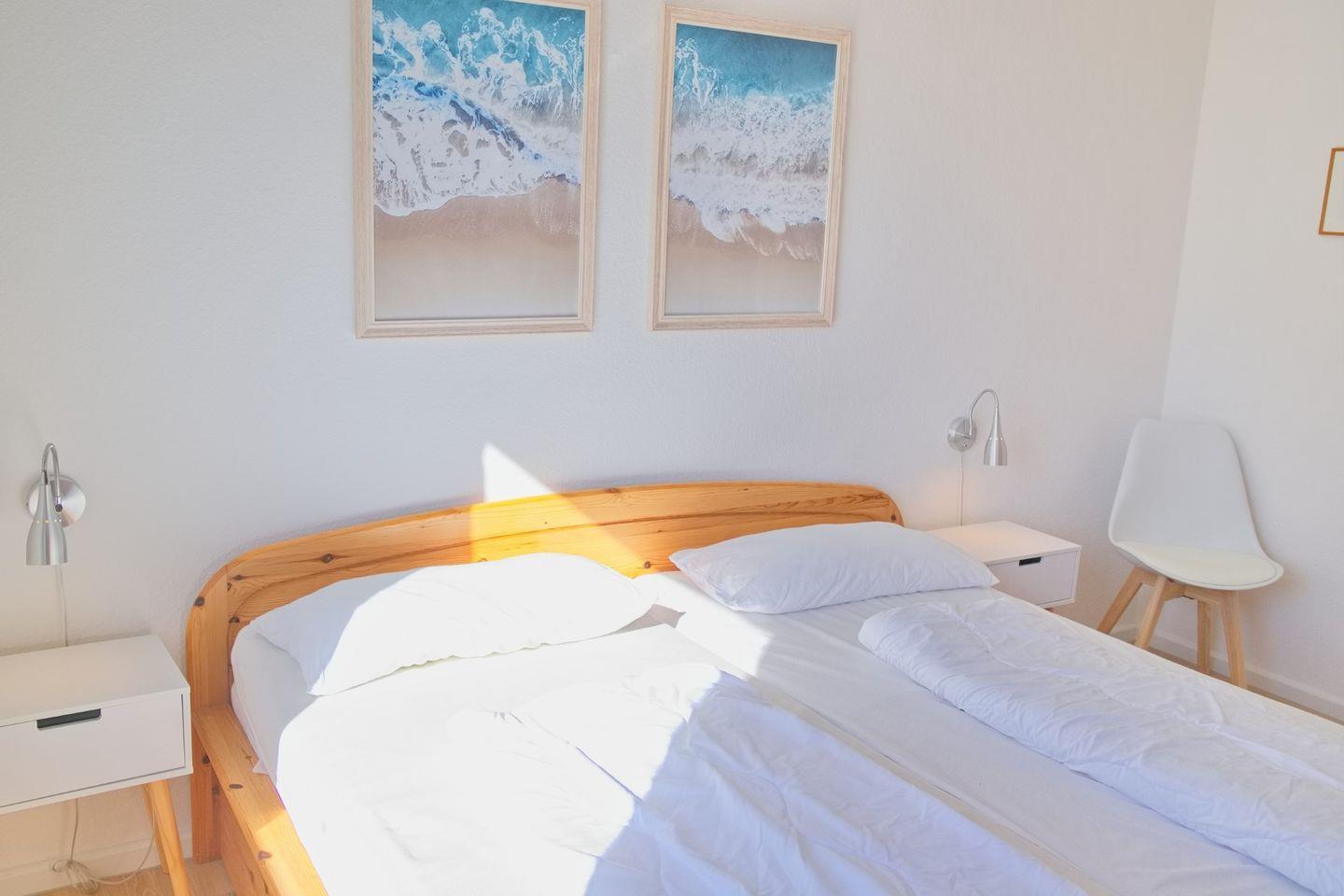 Zurück auf den Flur geht es weiter in das separate Schlafzimmer mit Doppelbett (x 90 x200 cm) und Kleiderschrank. Ein Kinderreisebettchen ist hier zustellbar. Verdunklungsmöglichkeiten in Form von Vorhängen sind vorhanden.