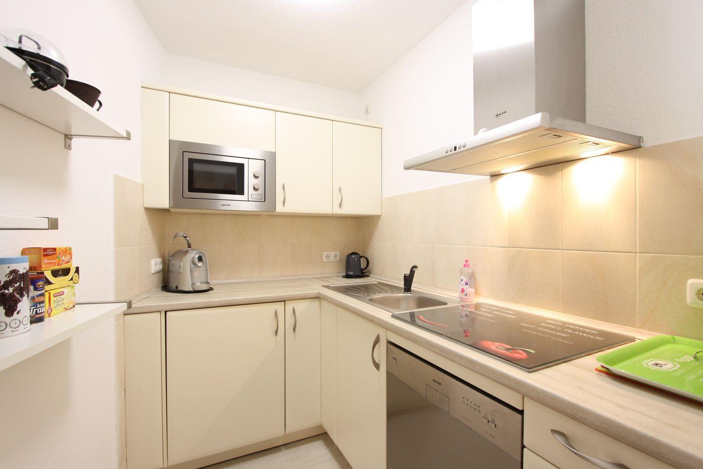 Zu Ihrer Linken kommen Sie in die separate Einbauküche mit Cerankochfeld, Mikrowelle mit Backfunktion, Geschirrspüler, Kühlschrank mit Gefrierfach, Wasserkocher, Toaster und Kaffeemaschine.