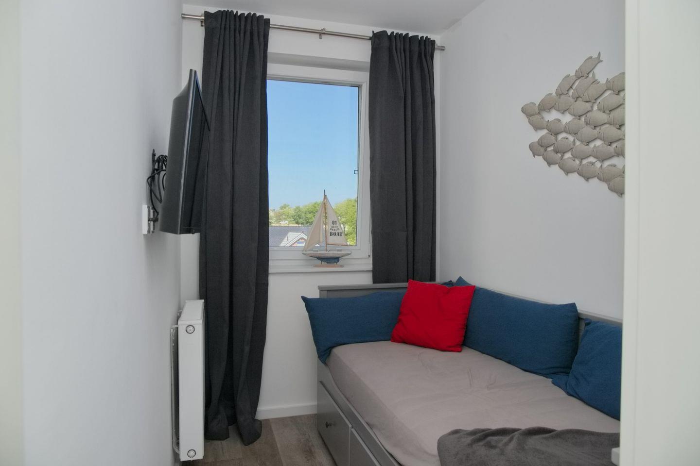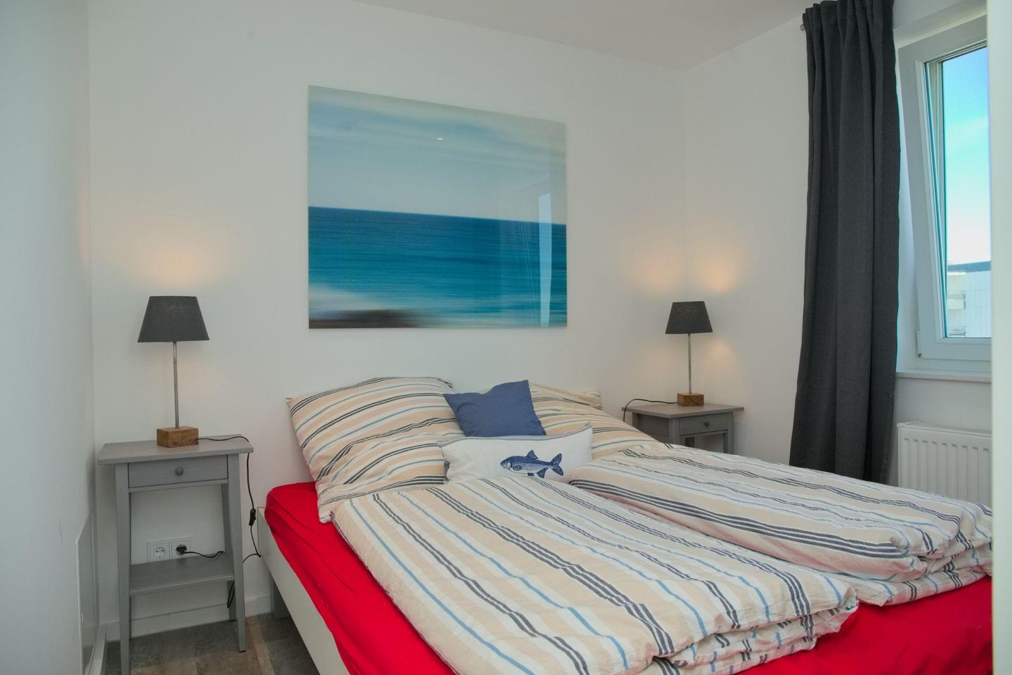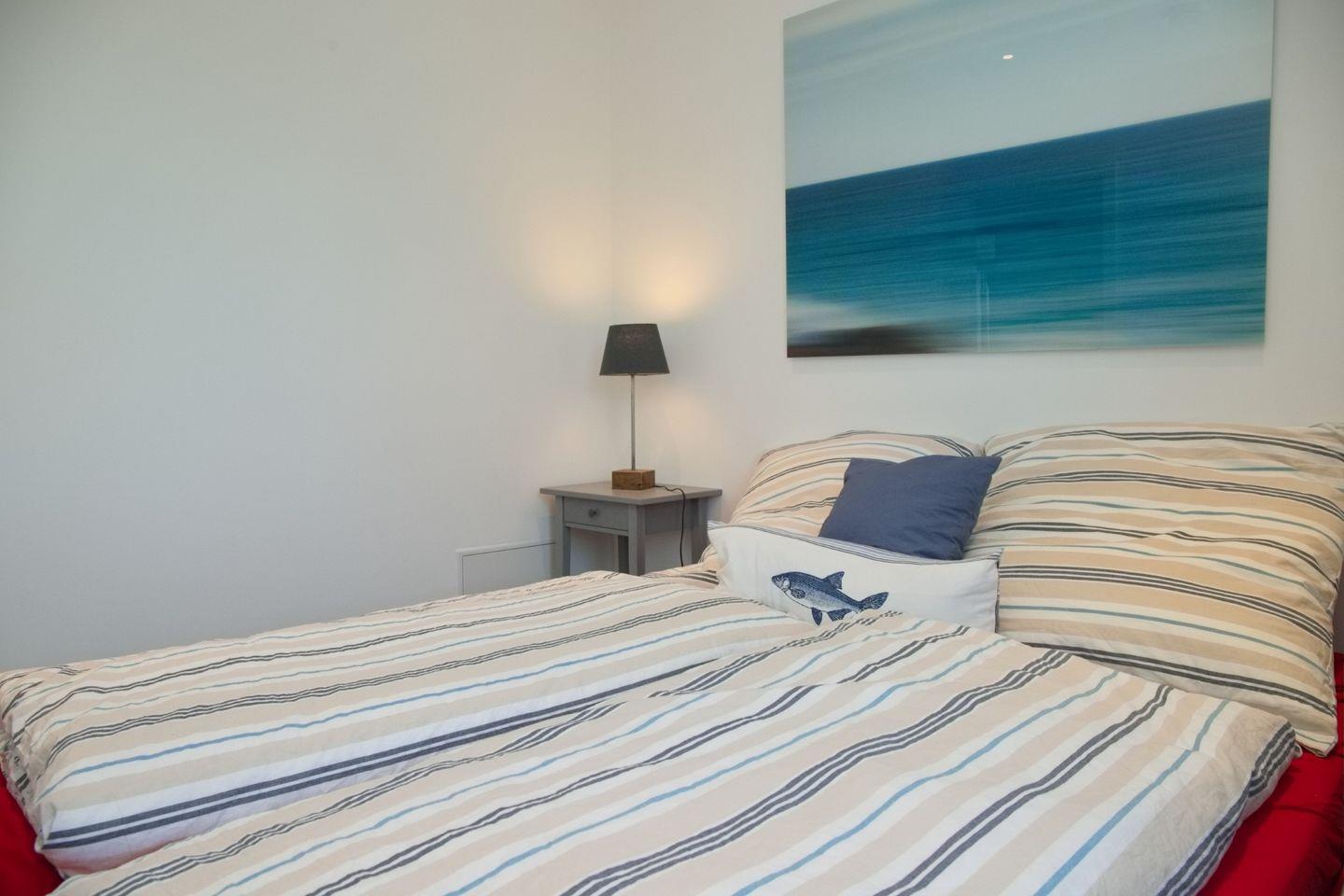 Die Wohnung verfügt über zwei Schlafzimmer, die beide stilvoll eingerichtet sind. Das Hauptschlafzimmer bietet ein komfortables Doppelbett (2x80x200 cm)und auch von hier aus kannst du den Blick auf das Meer genießen. Das zweite Schlafzimmer ist ebenfalls gemütlich und bietet ein Einzelbett (90x200 cm).