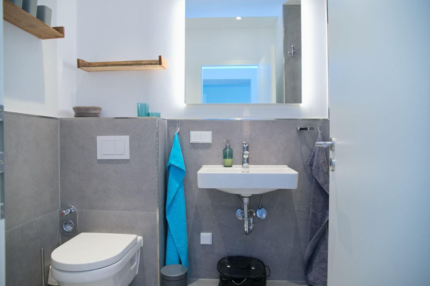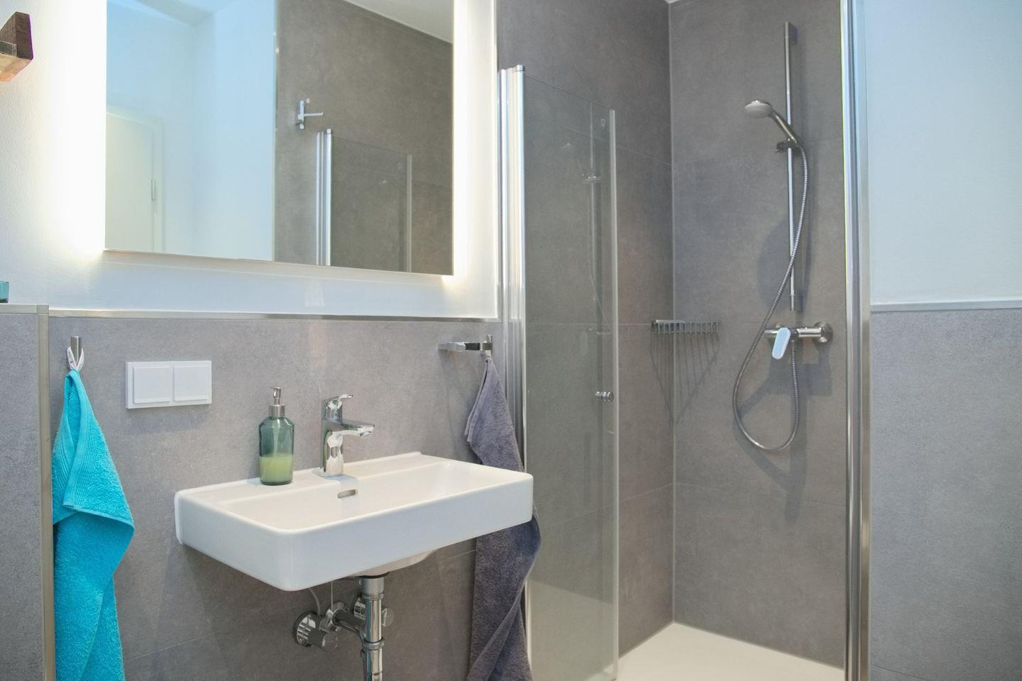 Das Badezimmer ist modern und elegant gestaltet. Es verfügt über eine ebenerdige Dusche, hochwertige Armaturen und stilvolle Fliesen. Hier kannst du dich nach einem Tag am Strand entspannen und erfrischen.