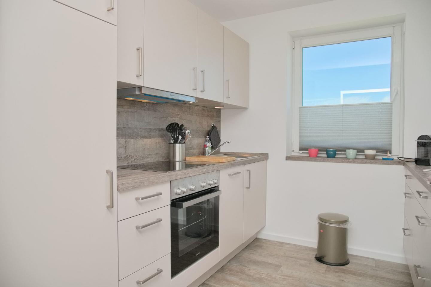 Die offene Küche ist vollständig ausgestattet und verfügt über moderne Geräte und alle Utensilien, die du für die Zubereitung von Mahlzeiten benötigst. Ein Esstisch in der Nähe des Fensters bietet einen idealen Ort, um deine Speisen mit Blick auf das Meer zu genießen.