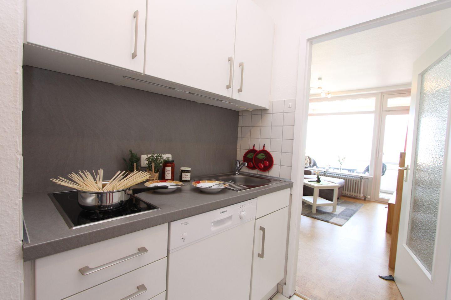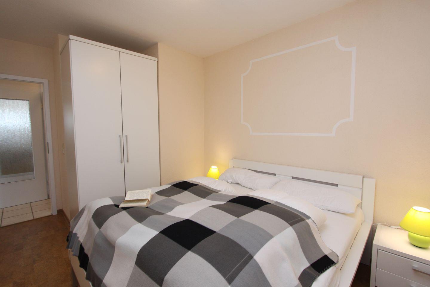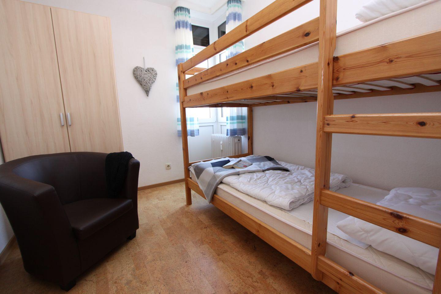 Diese 3-Zimmer-Wohnung (ca. 55 qm) für 4 Personen mit 100 % Seeblick und Eckbalkon in Süd-Ostlage ist nur 2 Gehminuten von der Promenade entfernt. Das Wohnzimmer ist ausgestattet mit einer Ecksofa, Flach-TV, Stereoanlage/Radio und einem Essbereich mit 4 Stühlen sowie dem Zugang zum Balkon. Die Einbauküche verfügt über einen Kühlschrank mit Gefrierfach, 2er-Cerankochfeld, Spülmaschine, Kaffeemaschine, Mikrowelle, Toaster und Wasserkocher. Im Schlafzimmer befinden sich ein Doppelbett (90 x 200 cm), 2 Nachttische und ein Kleiderschrank, im Kinderzimmer ein Etagenbett, Sessel und ein Kleiderschrank. Im hellen Bad gibt es eine Dusche, WC und einen Spiegelschrank. Alle Räume verfügen über Außenfenster.