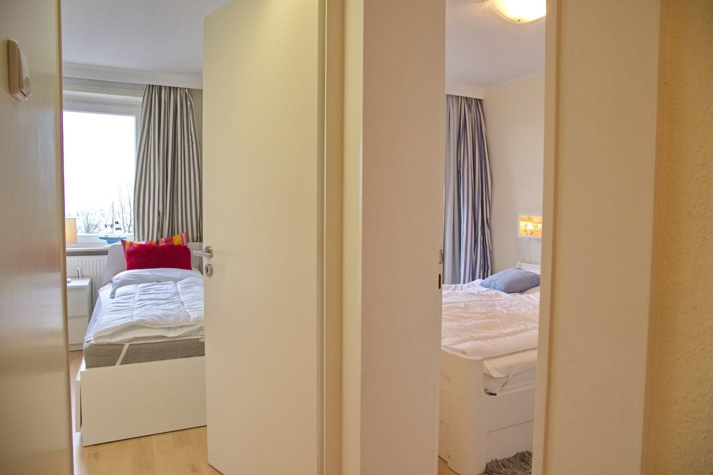 Das Schlafzimmer verfügt über ein Doppelbett (160 x 190 cm), das Kinderzimmer über 2 Einzelbetten mit abnehmbarer Kindersicherung.