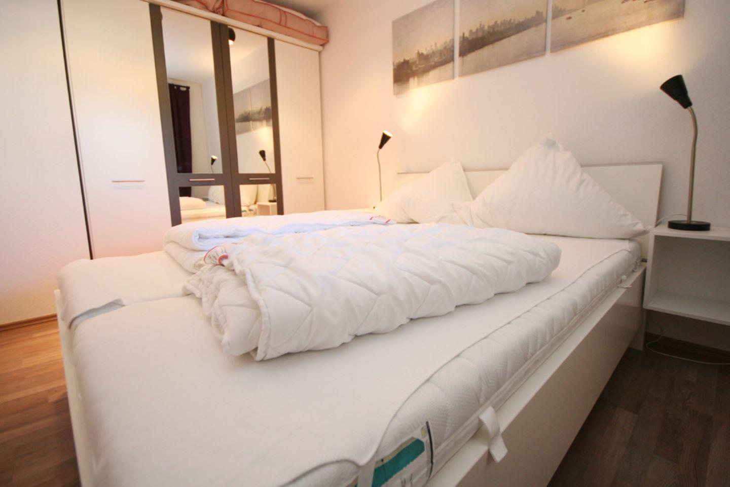 Im Schlafzimmer finden Sie ein Doppelbett mit Nachttischen, einen großen Kleiderschrank und einen weiteren Flachbild- TV.