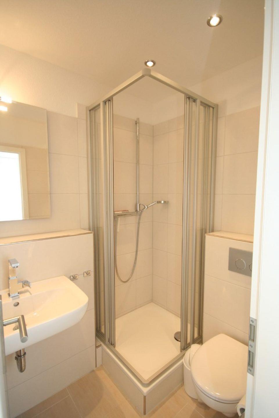 Das innen liegende Bad verfügt über eine Dusche, WC, Waschbecken, Spiegel und einer Handtuchheizung.