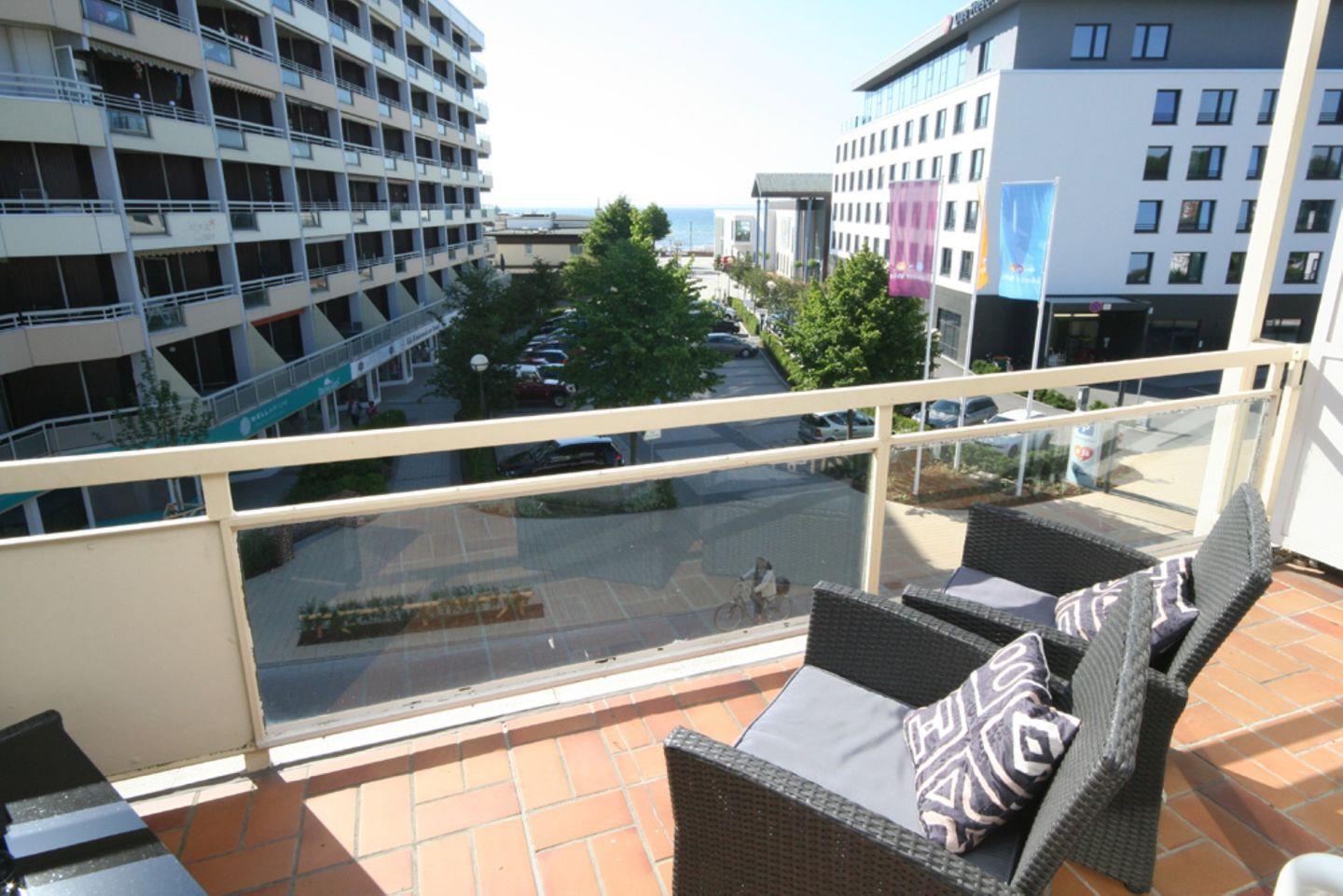 Zurück ins Wohnzimmer haben Sie Zugang zum Balkon mit Südausrichtung und Blick zum Meer. Hier lassen sich die Sommerabende traumhaft ausklingen.