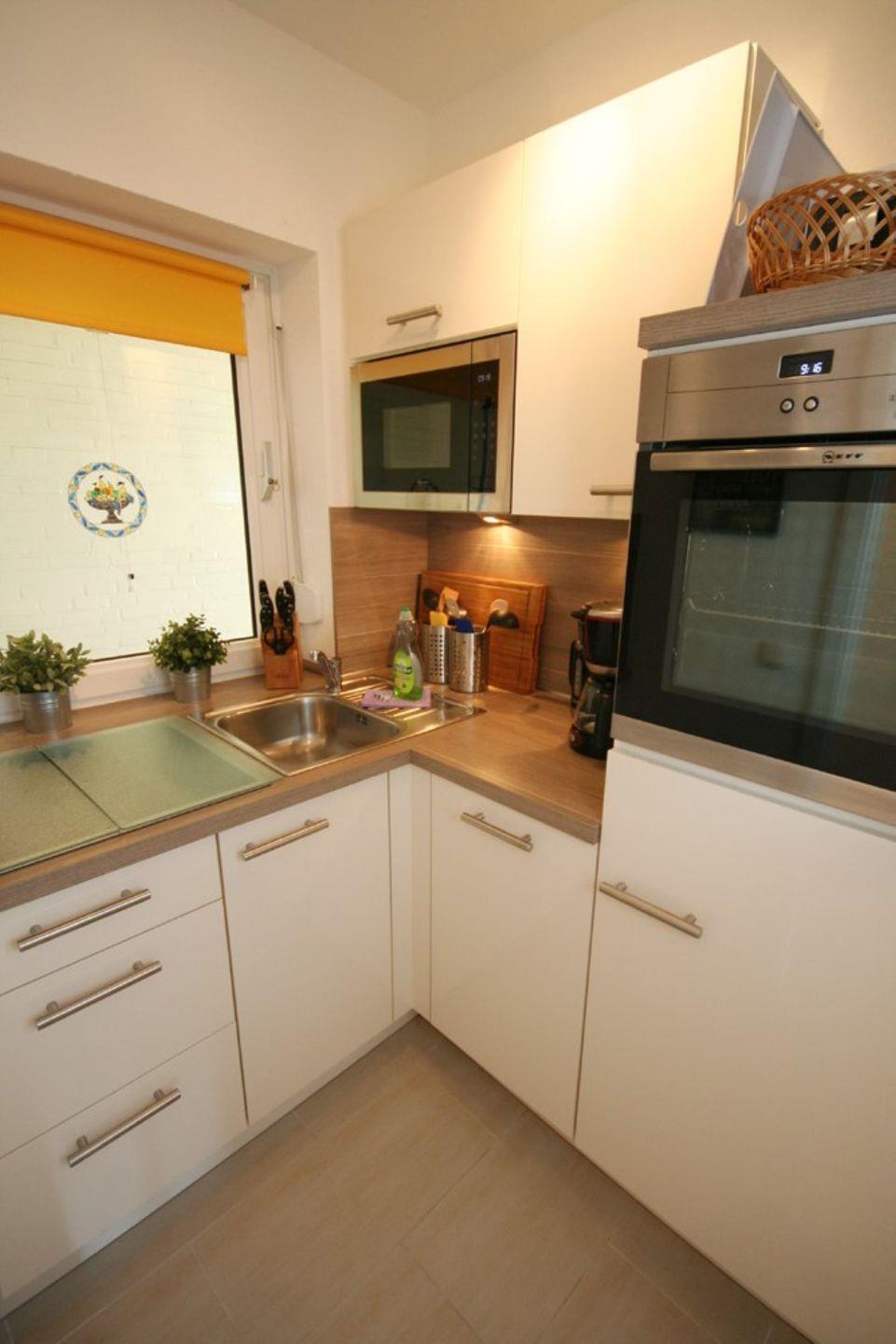 Zurück auf den Flur kommen Sie in die separate Einbauküche. Diese ist ausgestattet mit einem Cerankochfeld, einem Backofen in Komfort höhe, einer Mikrowelle, einem Kühlschrank mit Gefrierfach, einer Geschirrspülmaschine, einem Toaster, einem Wasserkocher und einer Kaffeemaschine. Ein Fenster zum Laubengang gibt hier zusätzliches Tageslicht.