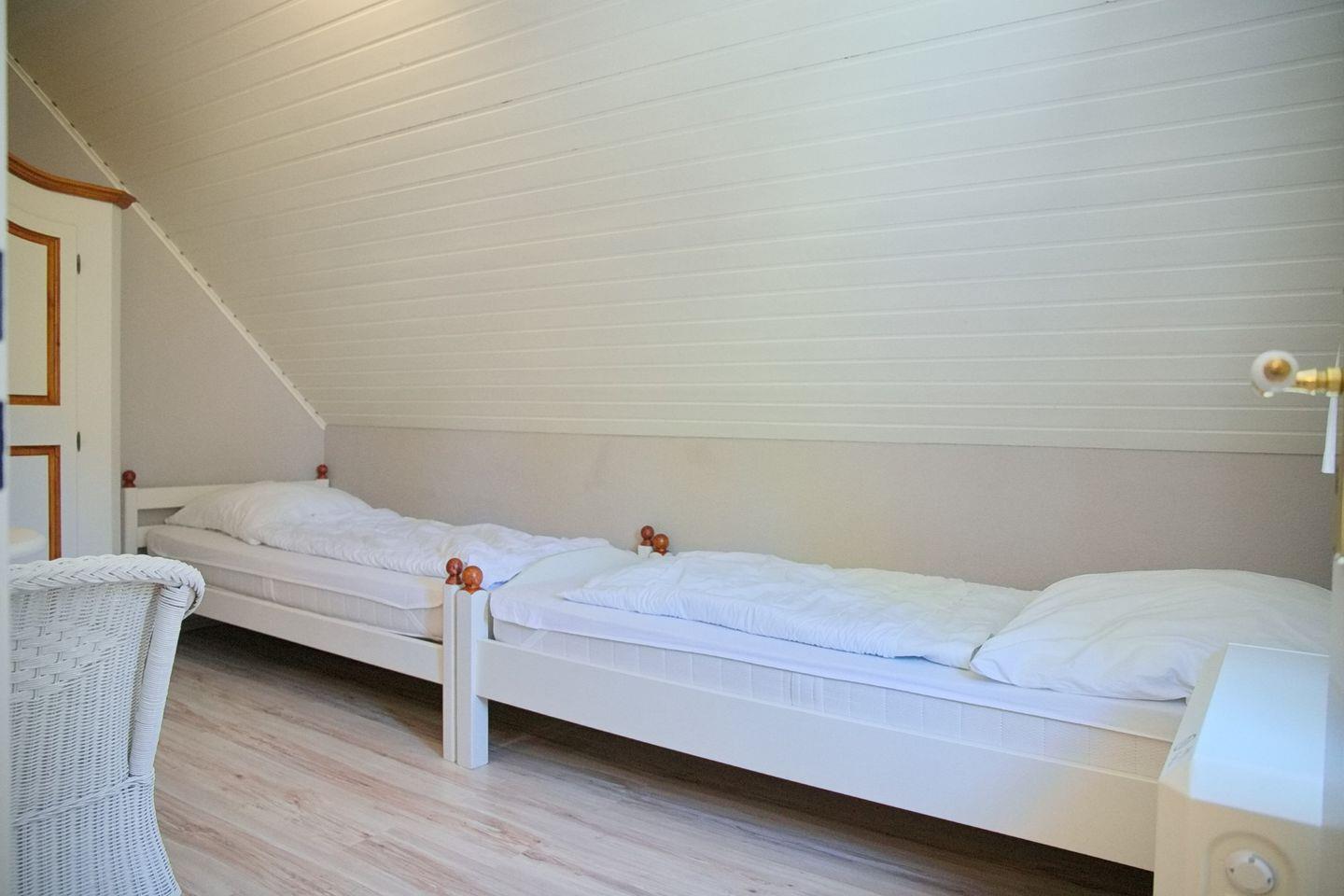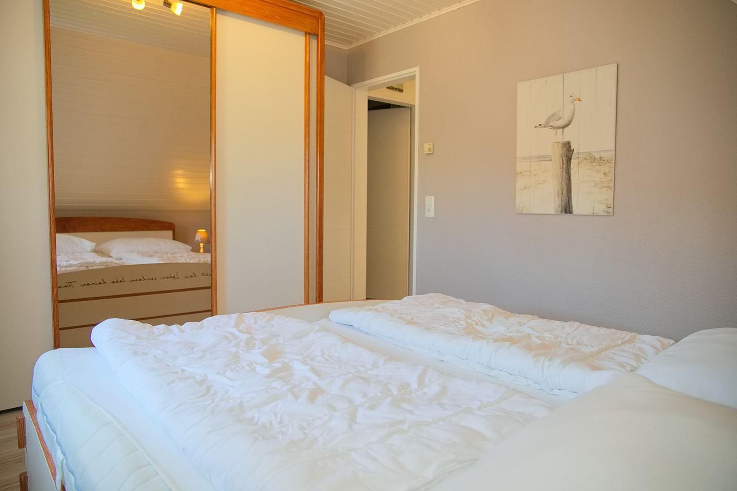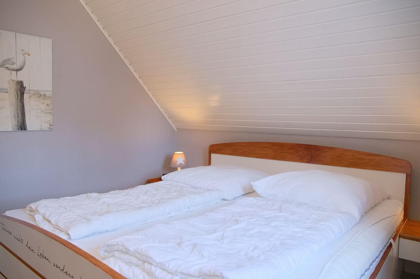 Das Obergeschoss des Hauses bietet Ihnen insgesamt zwei Schlafzimmer. Eines mit Doppelbett (180x200cm) und Kleiderschrank, das zweite mit zwei Einzelbetten (90x200cm) und Kleiderschrank.