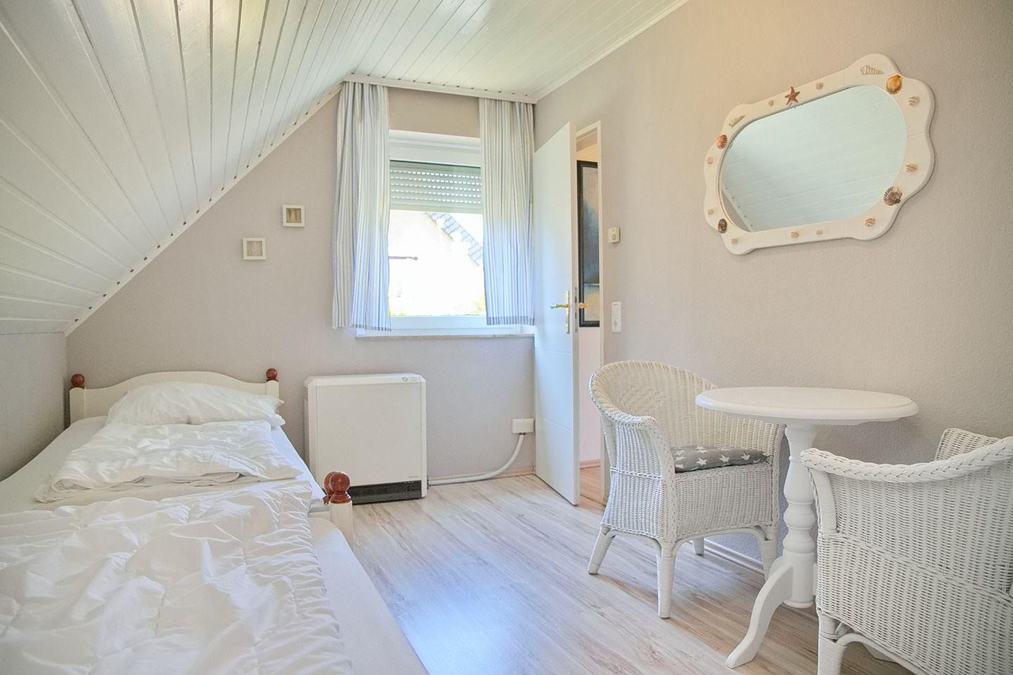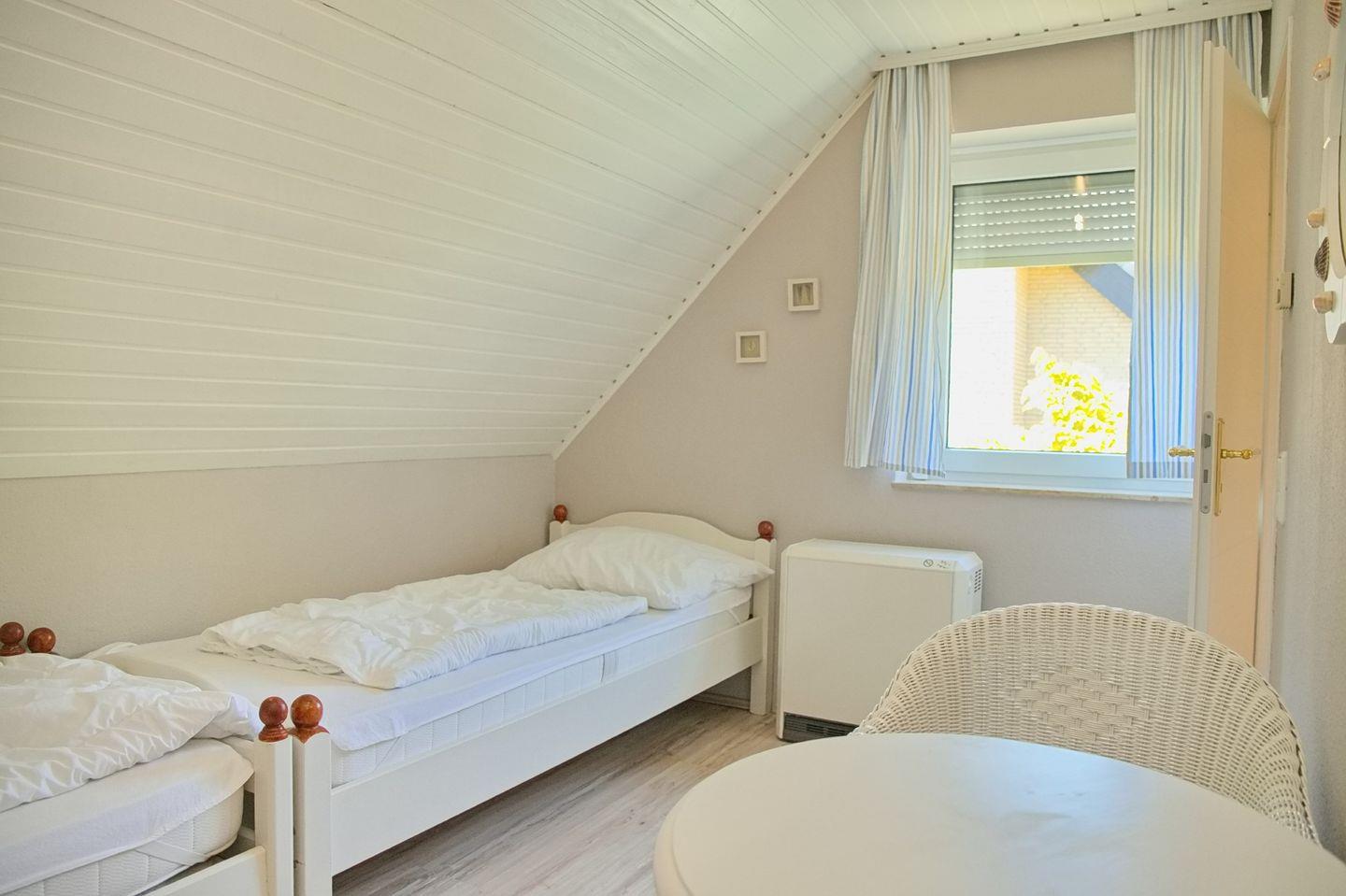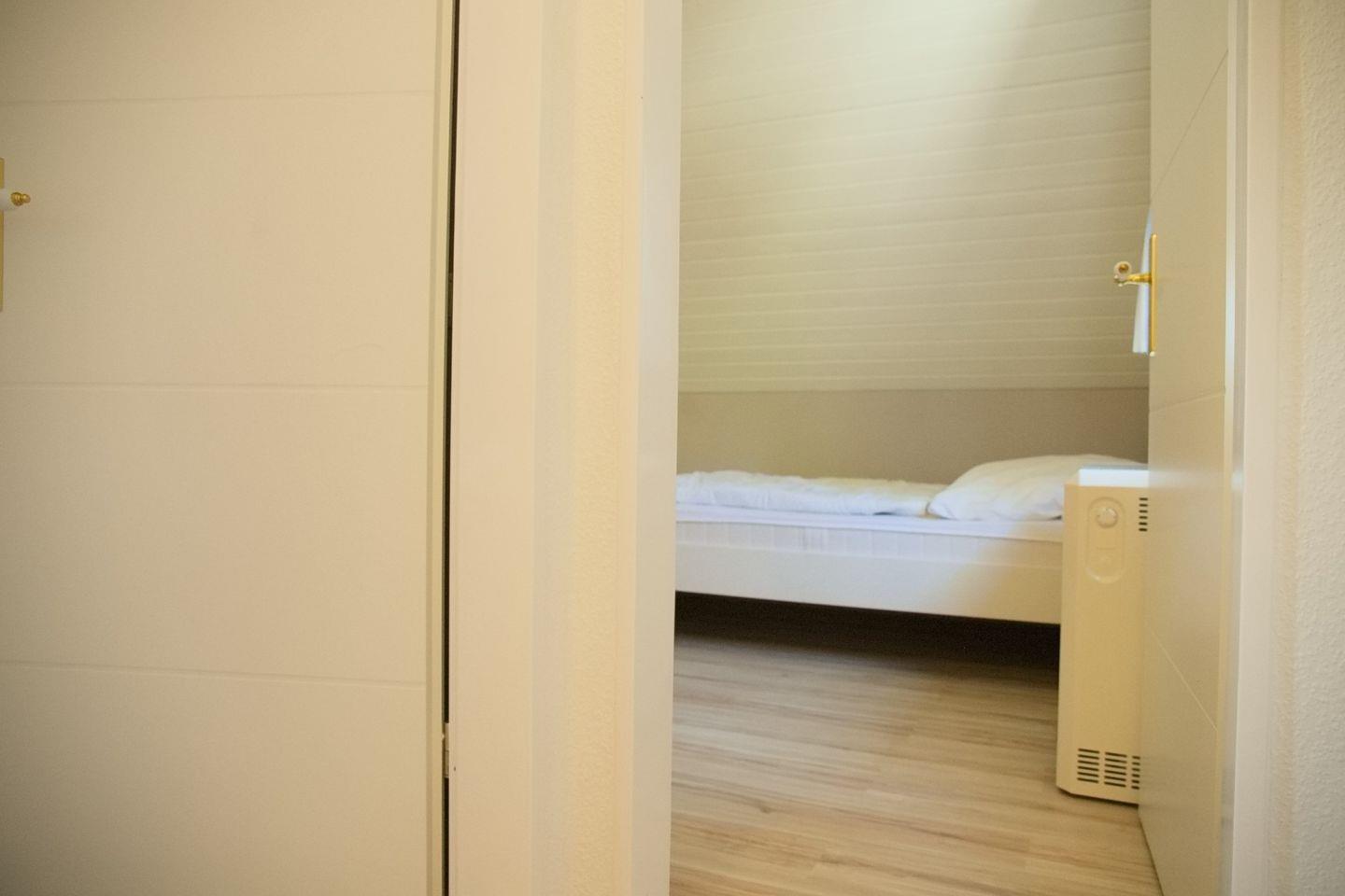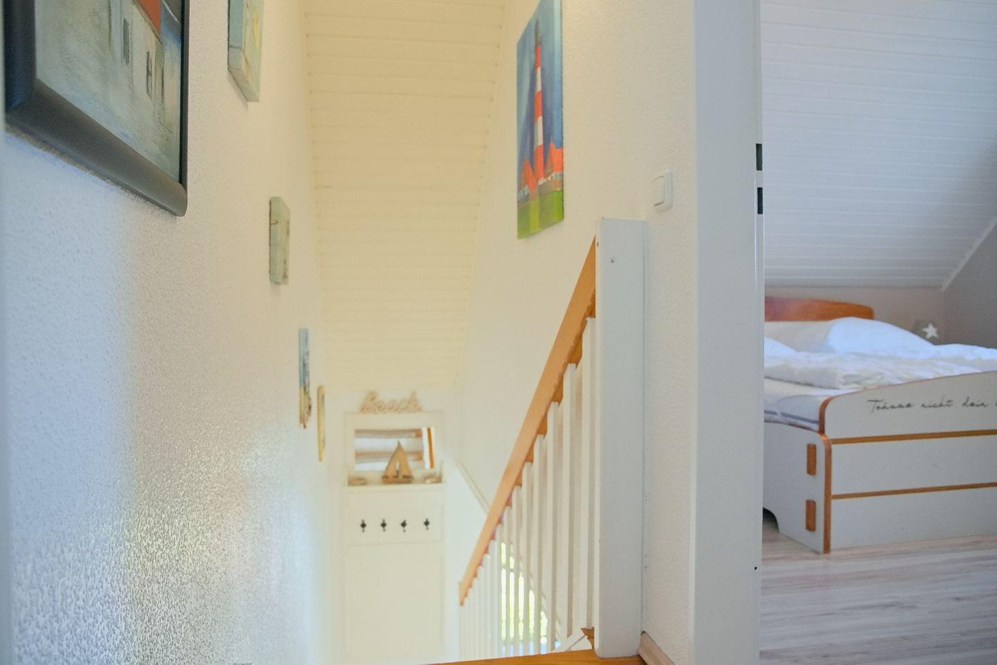 Das Obergeschoss des Hauses bietet Ihnen insgesamt zwei Schlafzimmer. Eines mit Doppelbett (180x200cm) und Kleiderschrank, das zweite mit zwei Einzelbetten (90x200cm) und Kleiderschrank.