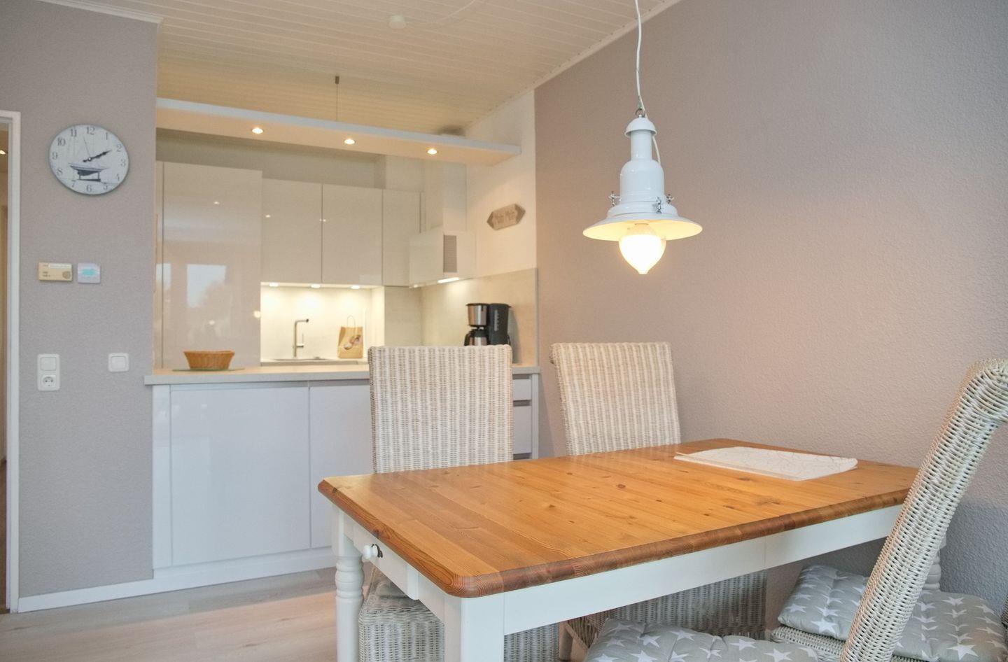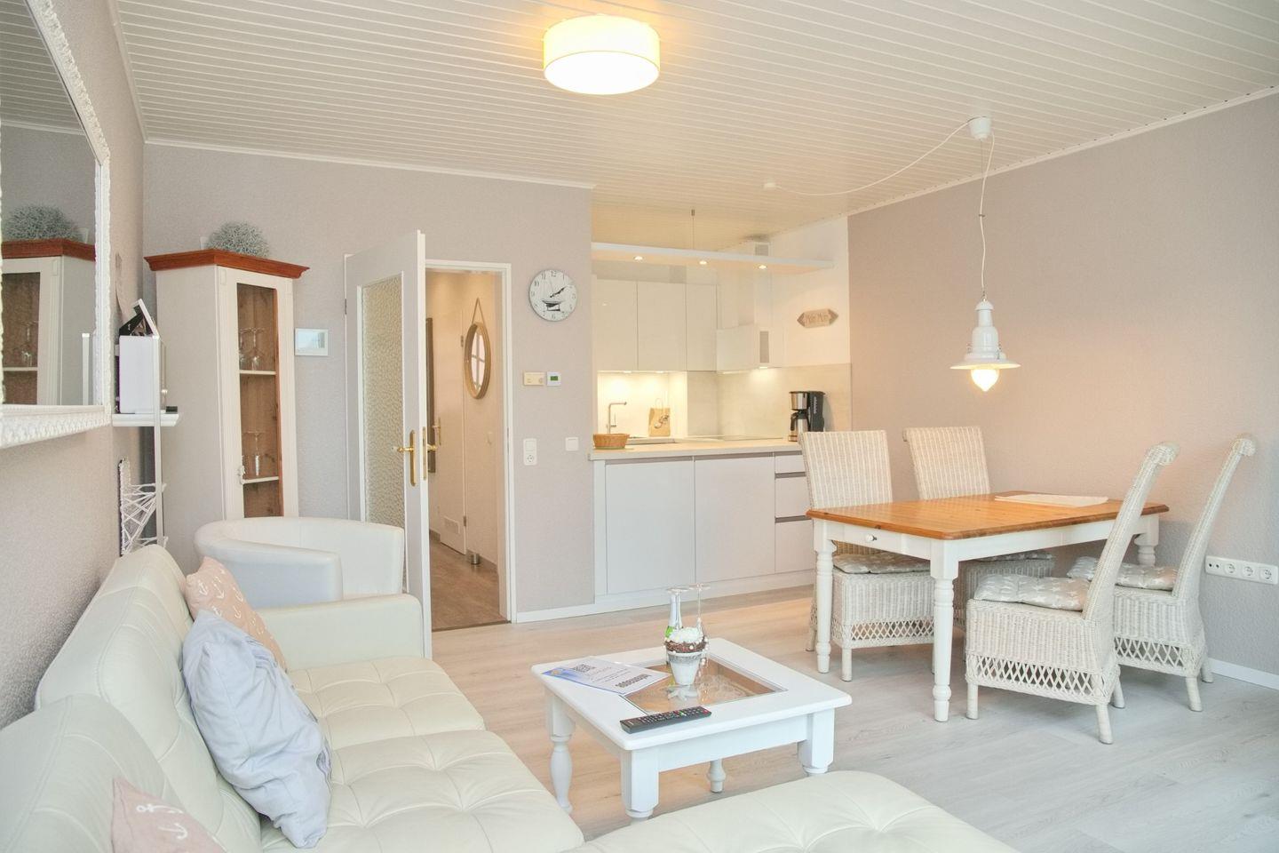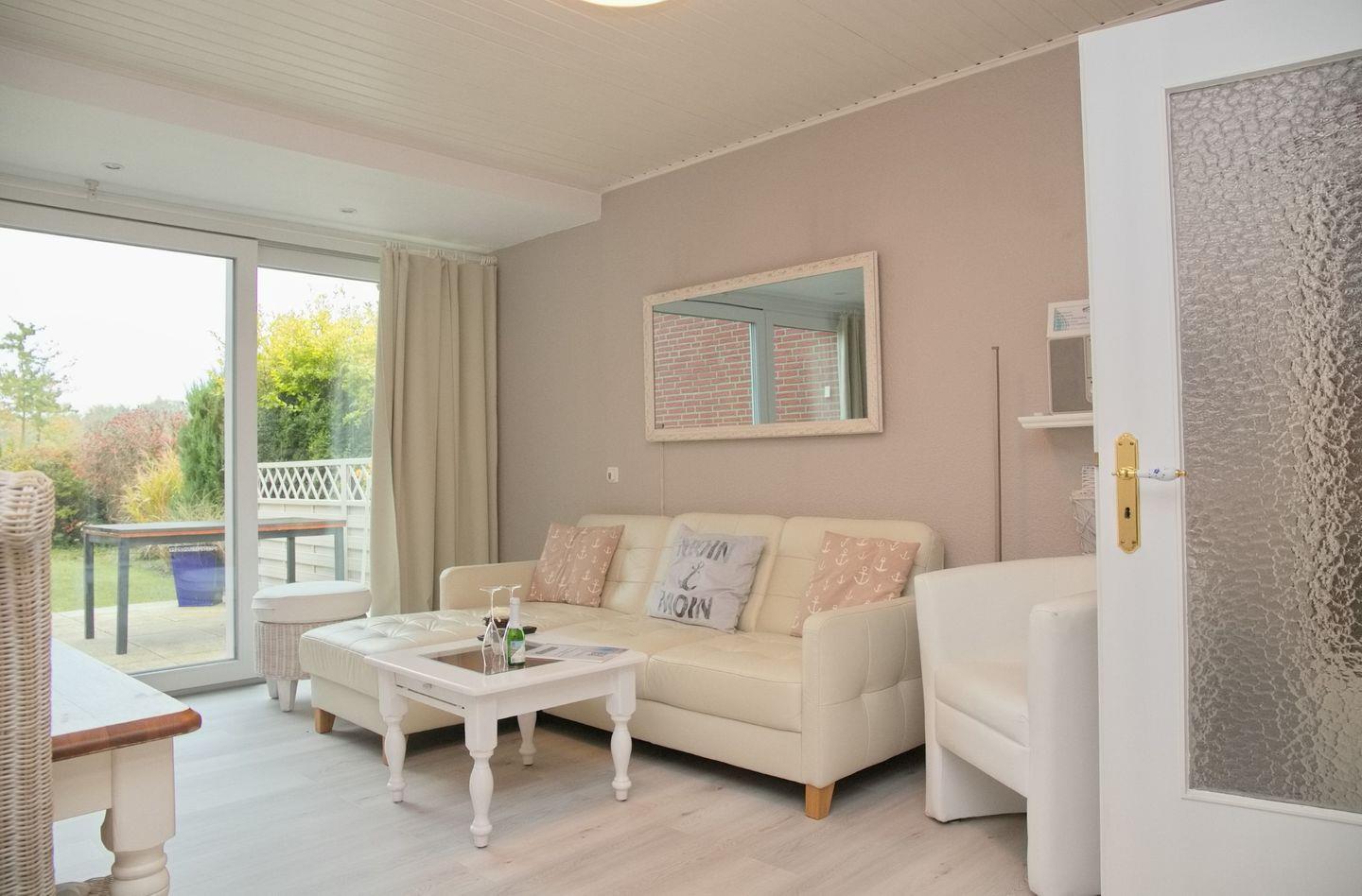 Der große Wohnraum ist dank des großen Terrassenelemts hell und mit einem einheitlichen Farbkonzept sehr geschmackvoll eingerichtet. Von der Couch haben Sie einen direkten Blick auf den Garten und in die Küche. Die moderne Küchenzeile bietet genug Platz, um ein gemeinsames Frühstück oder ein leckeres Dinner zuzubereiten.