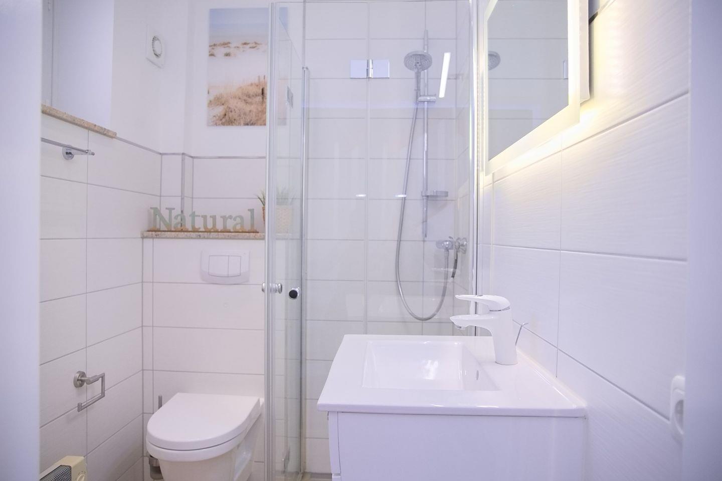 Vom Wohnbereich aus erreichen Sie direkt Ihre möblierte Terrasse, von der Sie die Sonnenstunden genießen können. Im Erdgeschoss des Hauses befindet sich auch das Badezimmer mit Dusche und WC.
