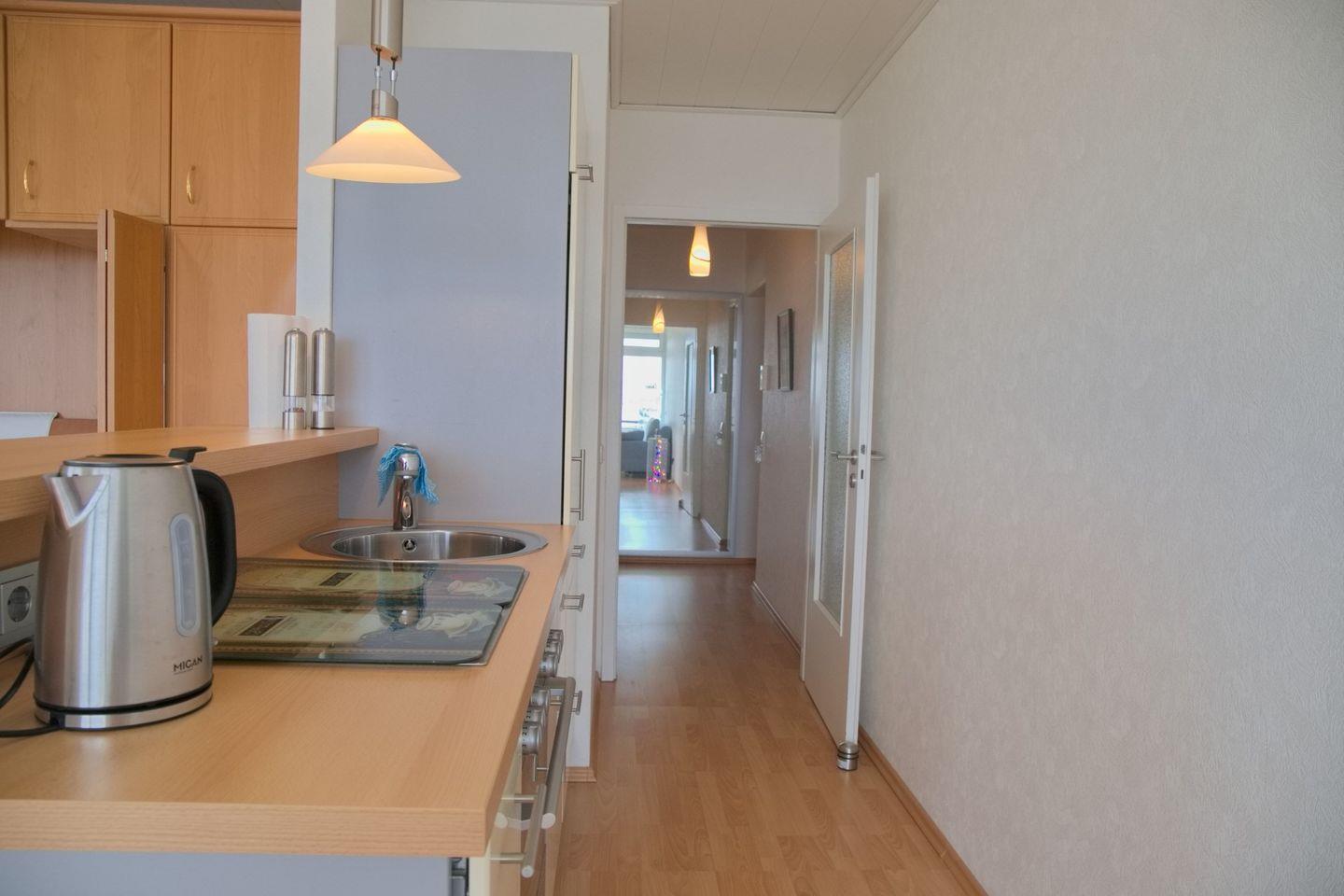 Die Küche ist gut ausgestattet mit einem Cerankochfeld, einem Backofen, einem Kühlschrank mit Gefrierfach, einem Wasserkocher, einem Toaster und einer Kaffeemaschine. Hier können Sie Ihre Lieblingsspeisen zubereiten und sich wie zu Hause fühlen.