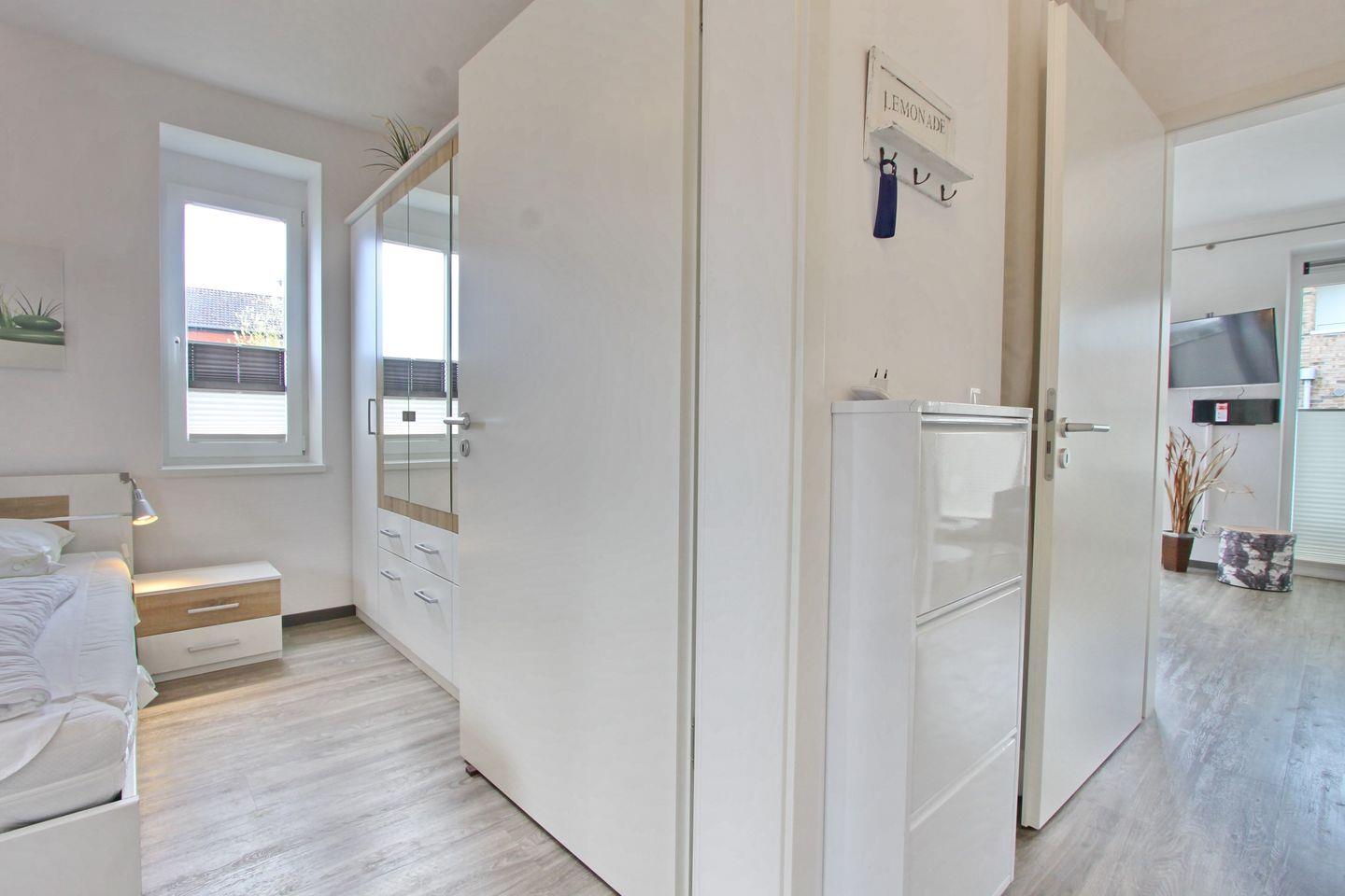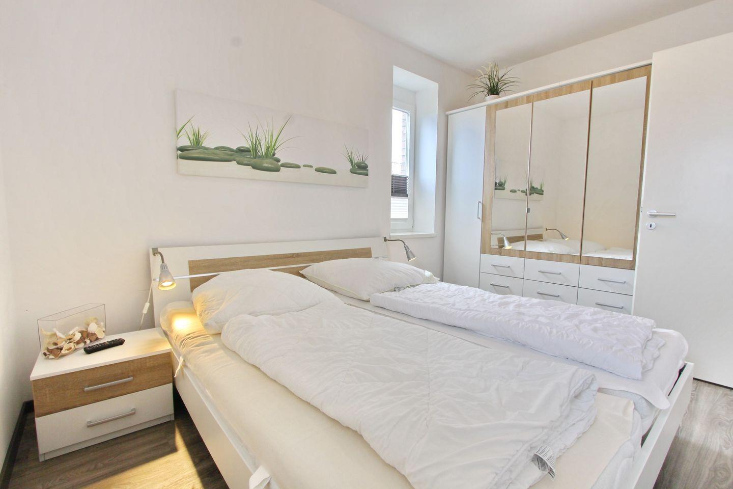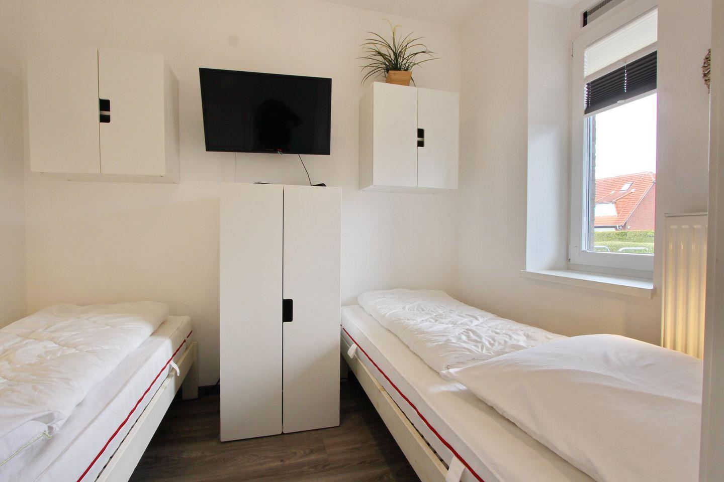 Im Elternschlafzimmer befindet sich ein Doppelbett, ein geräumiger Kleiderschrank und ein TV. Im Kinderzimmer stehen zwei Einzelbetten und auch hier finden Sie ein ein TV.