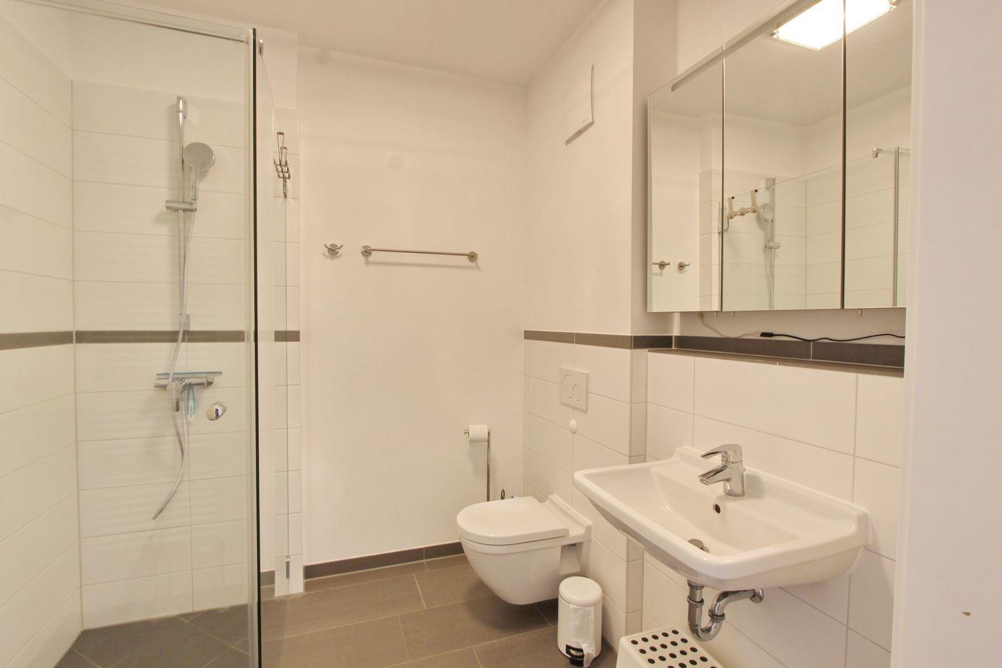 Das Badezimmer überzeugt mit seiner bodenebenen Dusche, einem WC, ein Waschbecken und einem Spiegel.