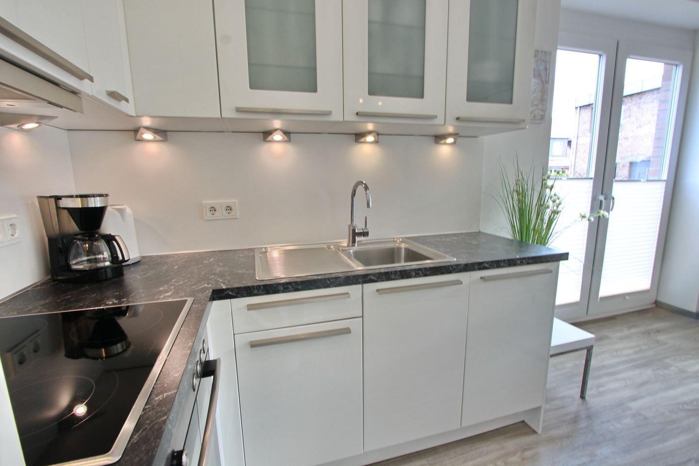 Die stilvolle Einbauküche verfügt über ein Ceranfeld, einen Backofen, eine Mikrowelle, einen Geschirrspüler, einen Kühlschrank mit Gefrierfach, einer Kaffeemaschine, einem Wasserkocher und einem Toaster.