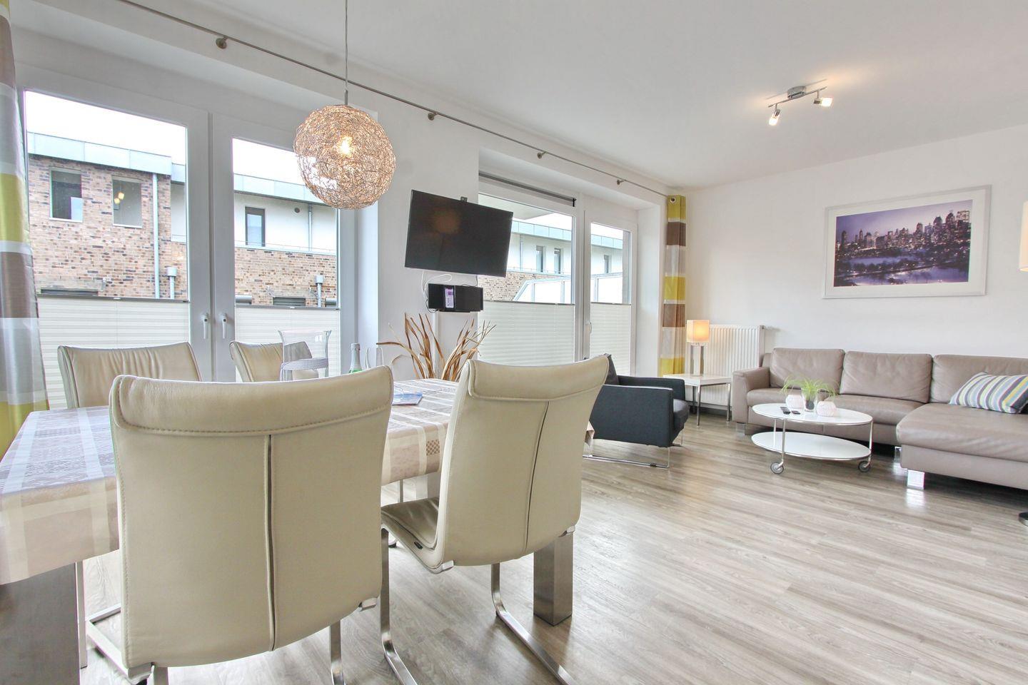 Das geräumige und moderne Wohnzimmer ist mit einer gemütlichen Eckcouch, einen bequemen Sessel, einen TV, ein Radio mit CD und einem Essbereich für 4 Personen ausgestattet.