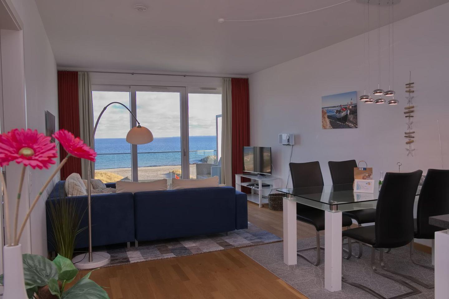 Auf dem großen möblierten Balkon mit Markise können Sie in der Sonne den Panoramablick über die Lübecker Bucht genießen.