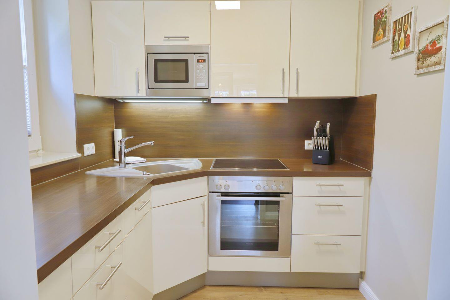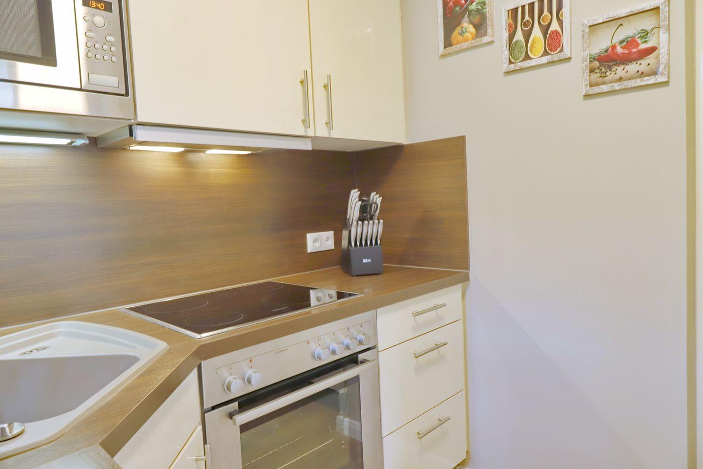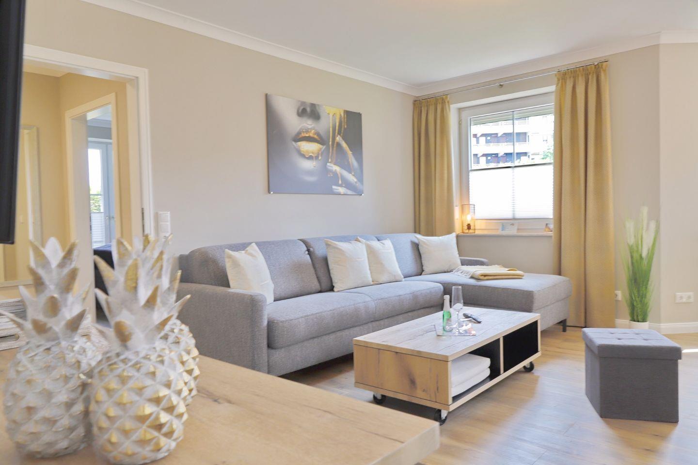 Ein moderner Ferientraum in Grömitz erwartet Sie mit diesem Appartement. Der liebevoll eingerichtete Wohnbereich bietet Ihnen eine moderne Eckcouch mit Schlaffunktion und extra Matratze mit einer Liegefläche von 160 x 195 cm und Flatscreen-TV. Der Essbereich ist harmonisch in das gesamt Konzept integriert und findet seinen Platz im Erker des Wohnzimmers. Die helle, toll ausgestattete Einbauküche gibt Ihnen alle Möglichkeiten, sich im Urlaub kulinarisch zu verwöhnen. Vom Wohnbereich aus erreichen Sie Ihre Terrasse, die im Sommer möbliert ist.