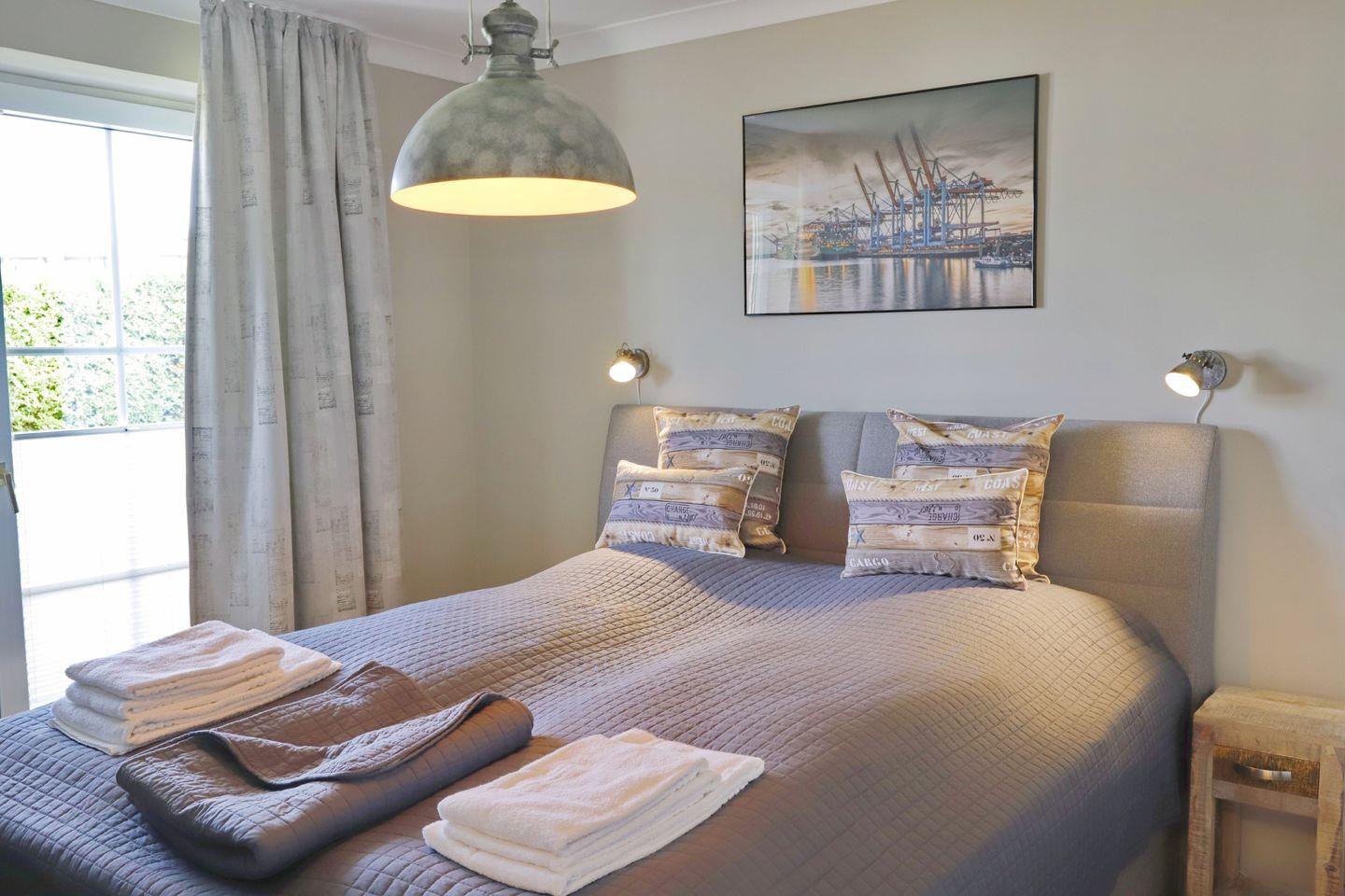Das Schlafzimmer wurde mit Flachbild-Fernseher, hochwertigen Doppelboxspringbett mit offenem Fußende und Qualitätsmöbeln geschmackvoll eingerichtet. Auch hier finden sich Accessoires im Shabby Chic und Industrial Look wieder.