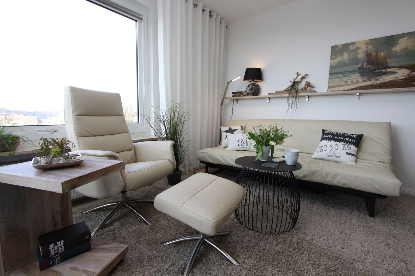Der gemütliche Wohnbereich besticht mit seiner stilvollen Couch mit Ausrichtung zur See, einem Fernsehsessel mit Beistelltisch und Flach- TV.