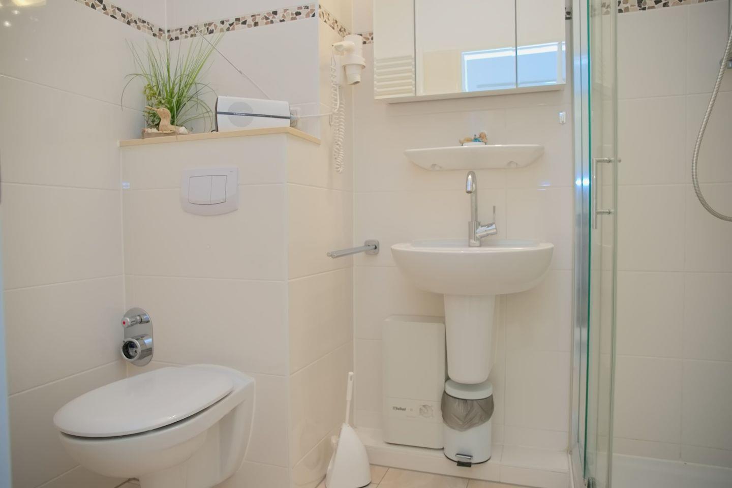 Wohnraum mit Flatscreen-TV und Radio, Küche mit Geschirrspüler, Backofen, Ceranherd, Filter-Kaffeemaschine, Balkon mit Gartenmöbeln, Schlafzimmer mit Flatscreen-TV, Badezimmer mit Dusche und WC. Waschmaschine und Trockner zur allgemeinen Nutzung im Haus.