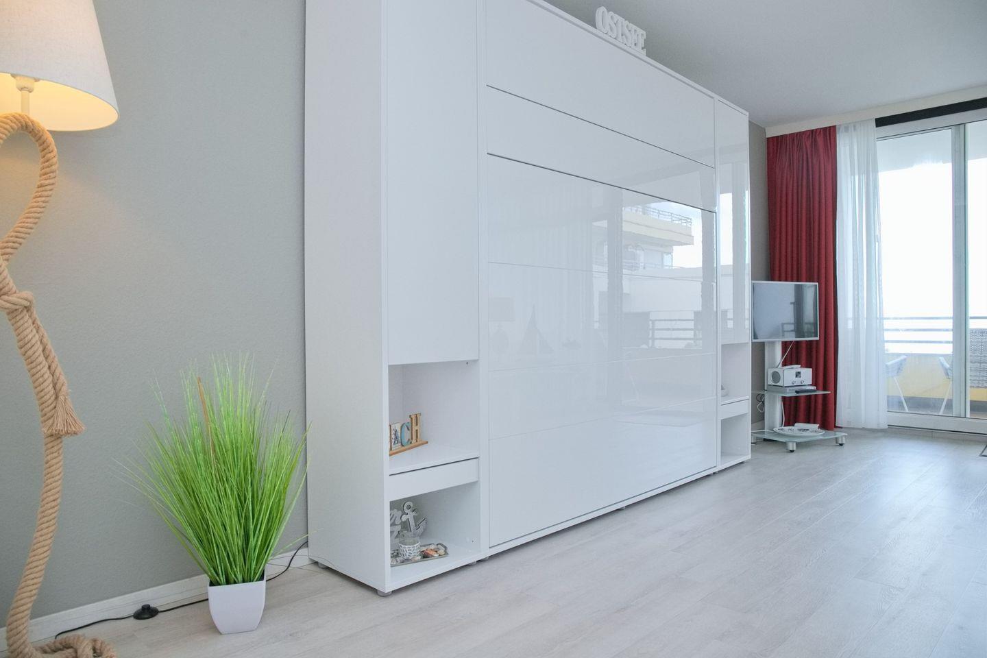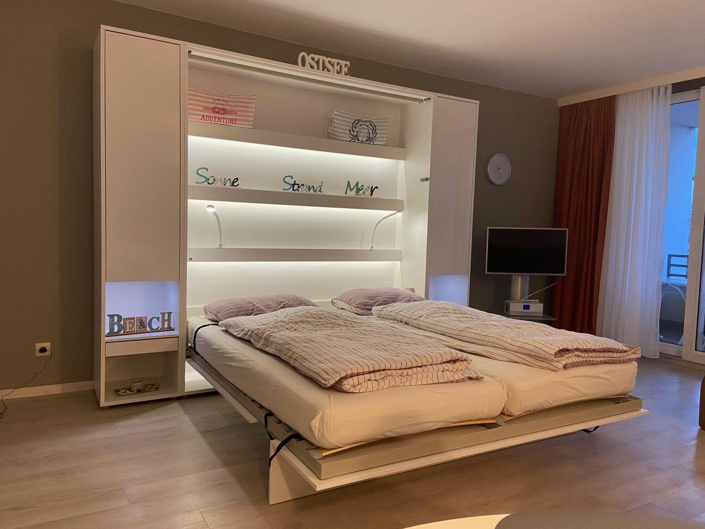 Der Wohnraum des Appartements bietet Ihnen eine gemütliche Ledercouch mit Sessel und Fußhocker, einen Flatscreen-TV und einen Essbereich. Ein Doppelschrankbett bieten einen zusätzlichen Schlafplatz für 2 Personen im Wohnzimmer. Die separate Küche verfügt über einen Geschirrspüler, Backofen, Ceranherd und Kaffeemaschine und ist somit mit allem ausgestattet, was das Urlaubsherz begehrt. Vom Wohnraum aus können Sie Ihren Balkon betreten, der im Sommer mit Gartenmöbeln ausgestattet ist. Auf gleicher Ebene finden Sie ein Schlafzimmer mit zwei Einzelbetten und Flatscreen-TV. Ein Badezimmer mit Dusche und WC komplettiert die Wohnung. Ein kostenfreier Strandkorb direkt am Strand bei der Vermietung Müller steht für das Jahr 2024 von April bis September zur Verfügung.