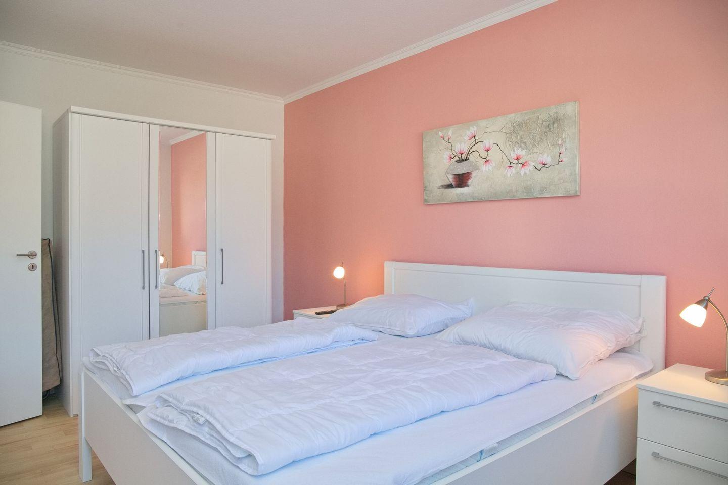 Das Schlafzimmer ist mit einem gemütlichen Doppelbett, einem weiteren TV und einem geräumigen Kleiderschrank ausgestattet, sodass Sie sich wie zu Hause fühlen können. Das moderne Bad bietet eine bodengleiche Dusche, ein WC, einen Waschtisch und einen beleuchteten Spiegelschrank – so starten Sie frisch und erholt in den Tag.