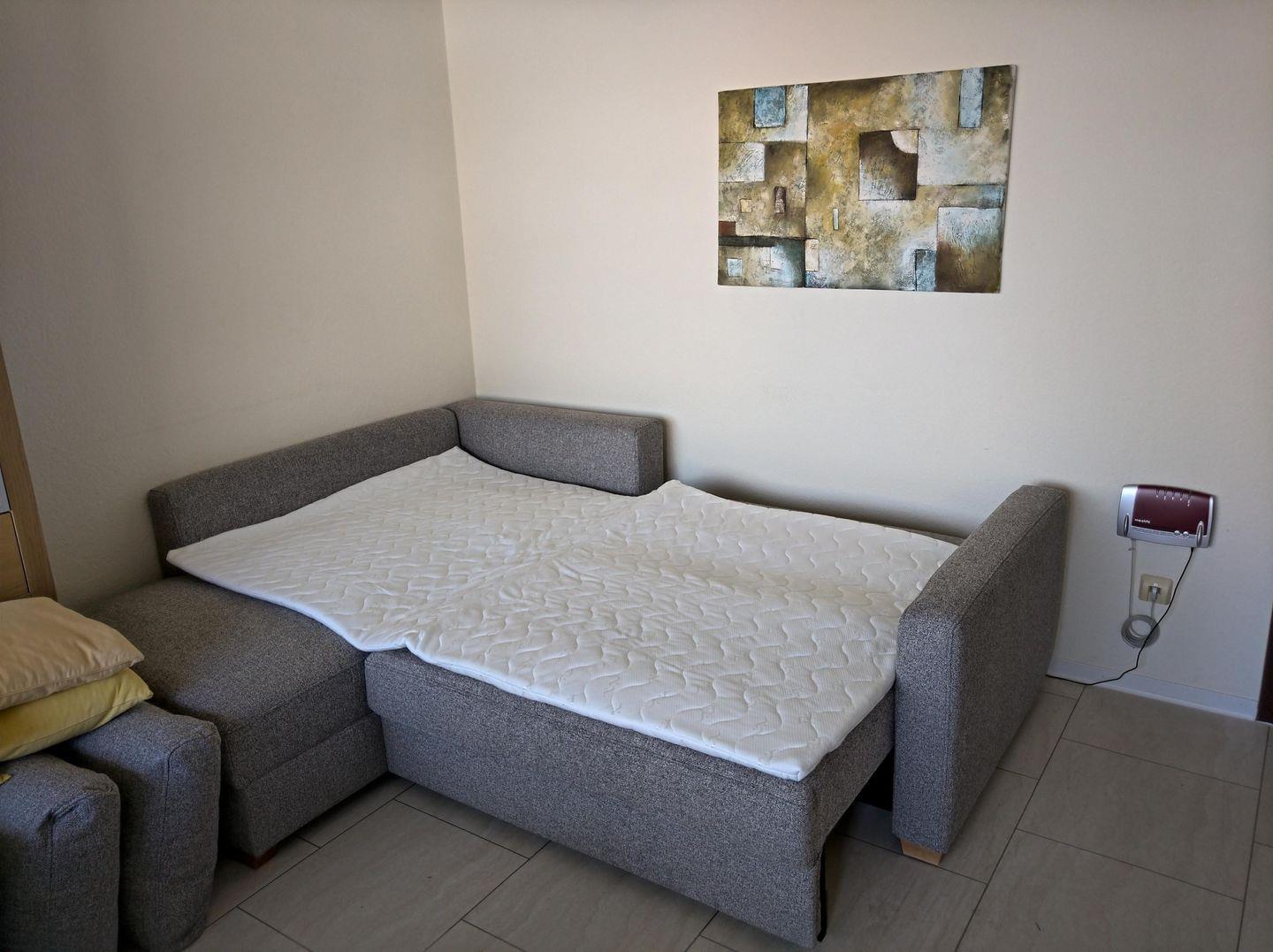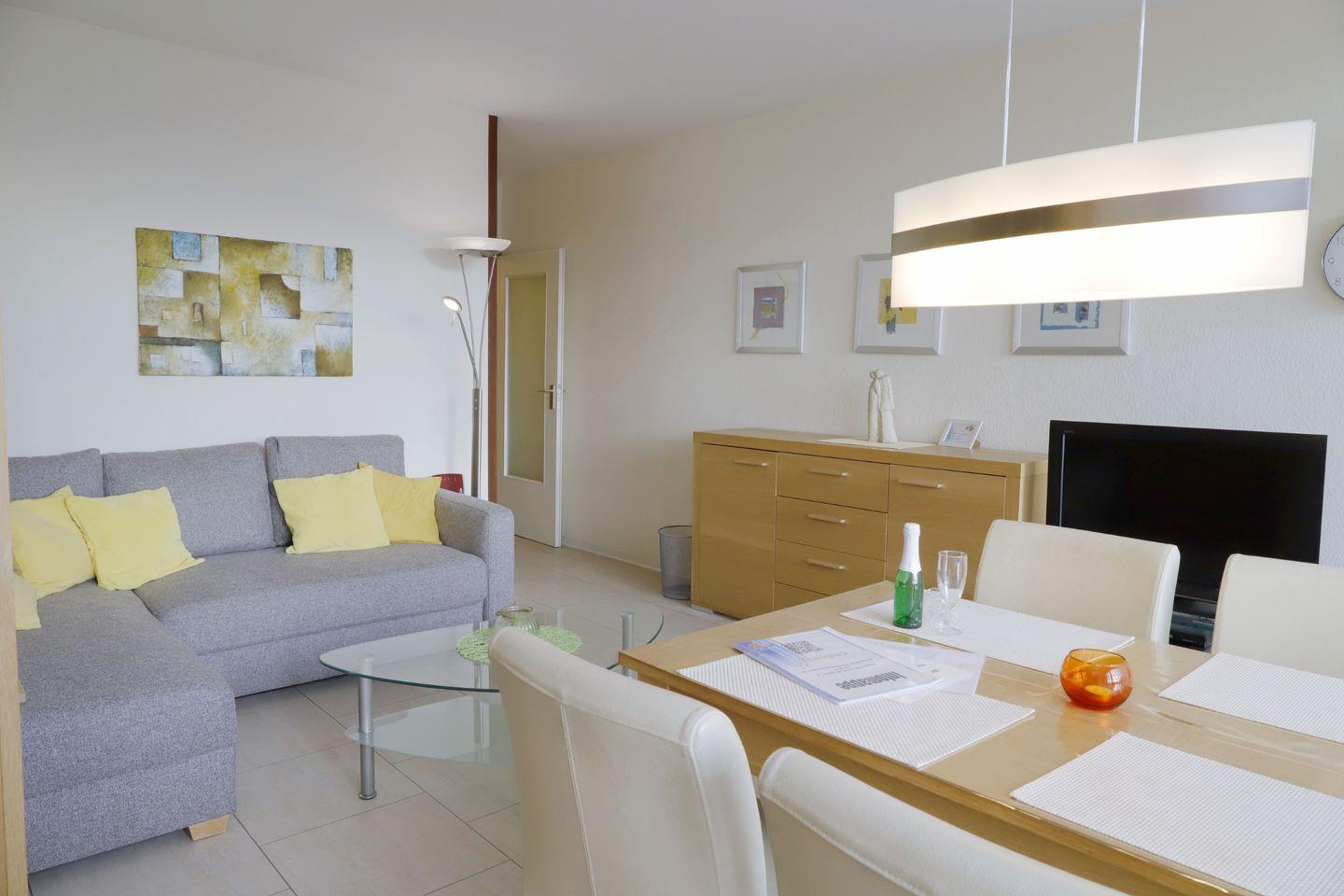 Willkommen in dieser 2-Zimmer-Ferienwohnung mit Südbalkon, die dir einen angenehmen und komfortablen Aufenthalt bietet. Die Wohnung besticht durch ein gemütliches Wohnzimmer mit einer Schlafcouch, einem großen Flachbild-TV sowie einer Stereoanlage mit Bluray-Player.
