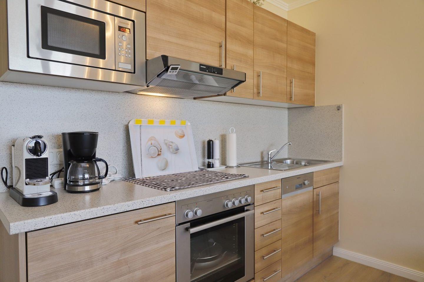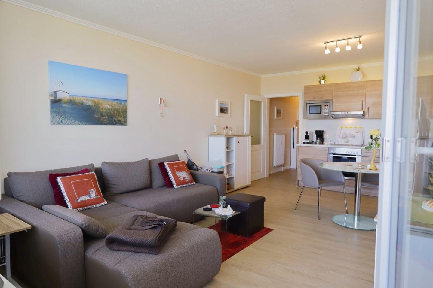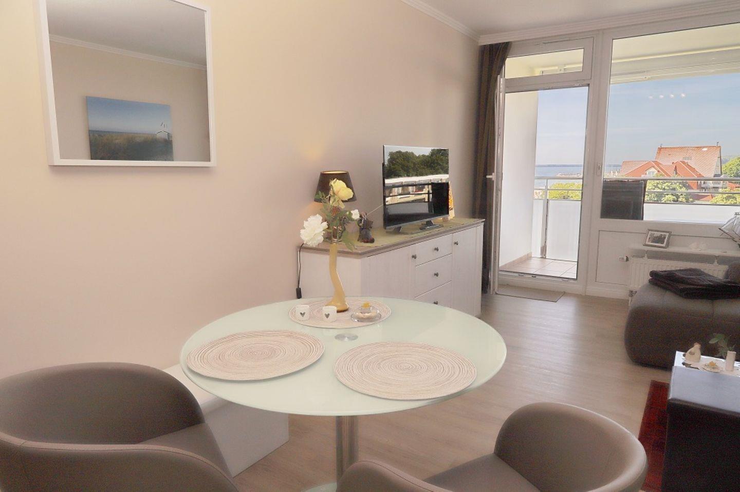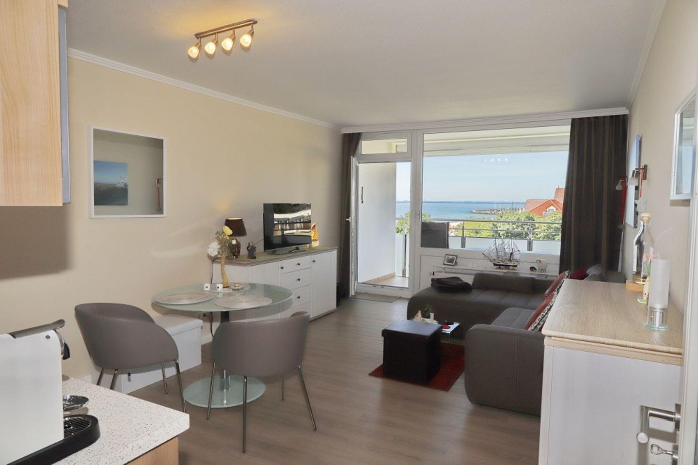 Die offene Küche ist modern eingerichtet und bietet Ihnen eine Mikrowelle, einen Geschirrspüler, ein Cerankochfeld mit Backofen und Dunstabzug und einen Esstisch. Vom Wohnzimmer aus erreichen Sie den Balkon, auf dem Sie im Sommer die Nachmittag und Abendsonne genießen können, sowie den Blick über den Yachthafen schweifen lassen.