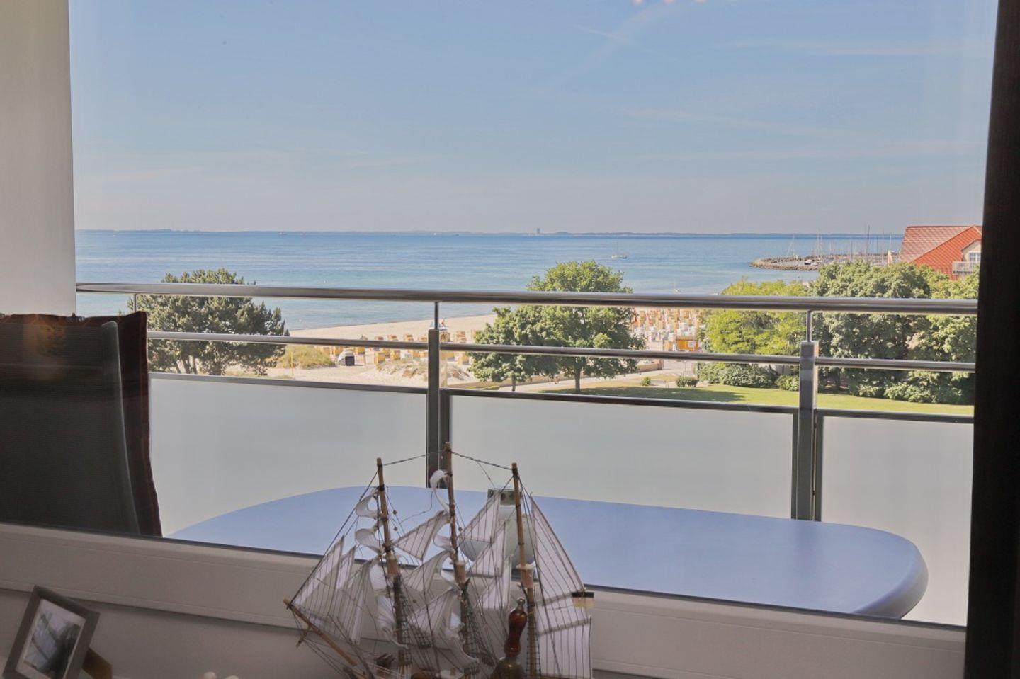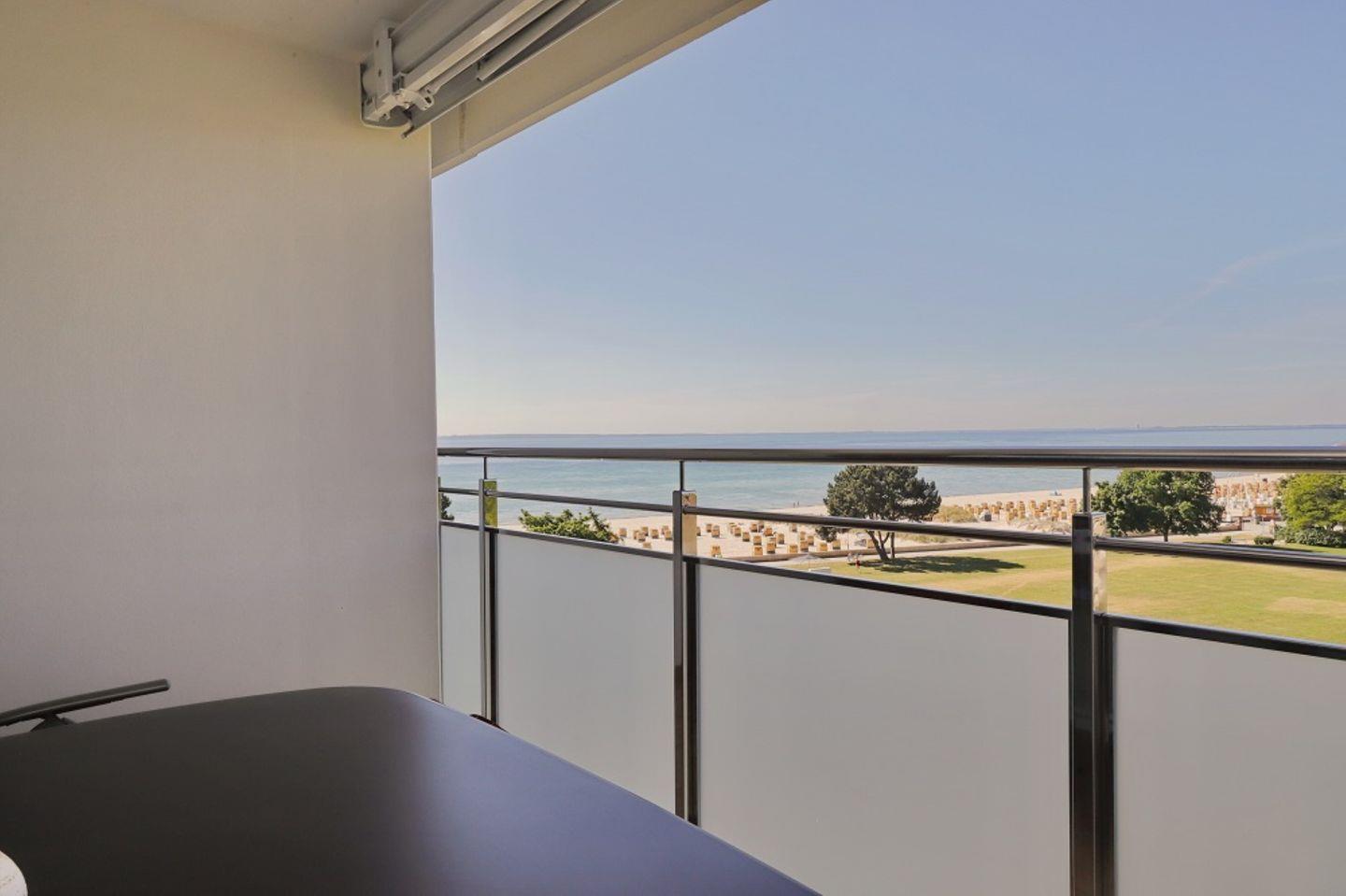 Moderne 2 Zimmer Ferienwohnung in der 5. Etage mit möblierten Süd/ Westbalkon und Markise und direkter Meerblick. Nur ein Steinwurf vom Meer entfernt.