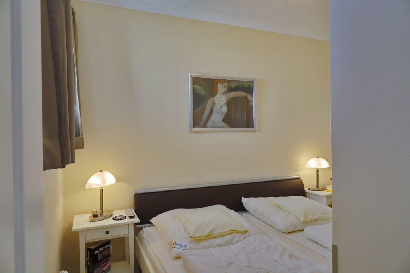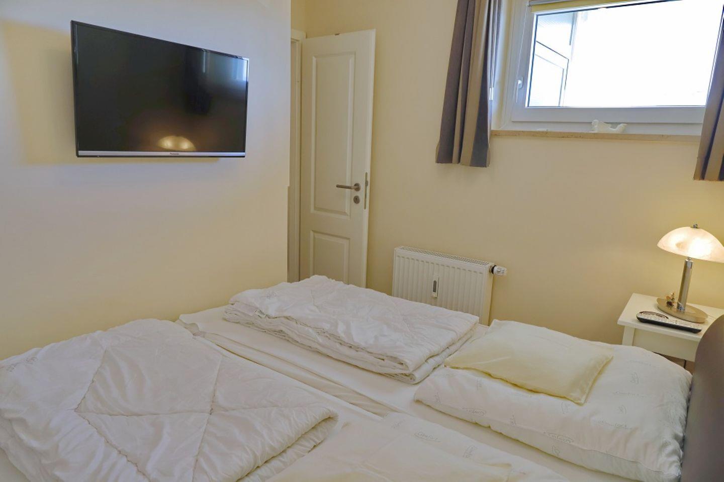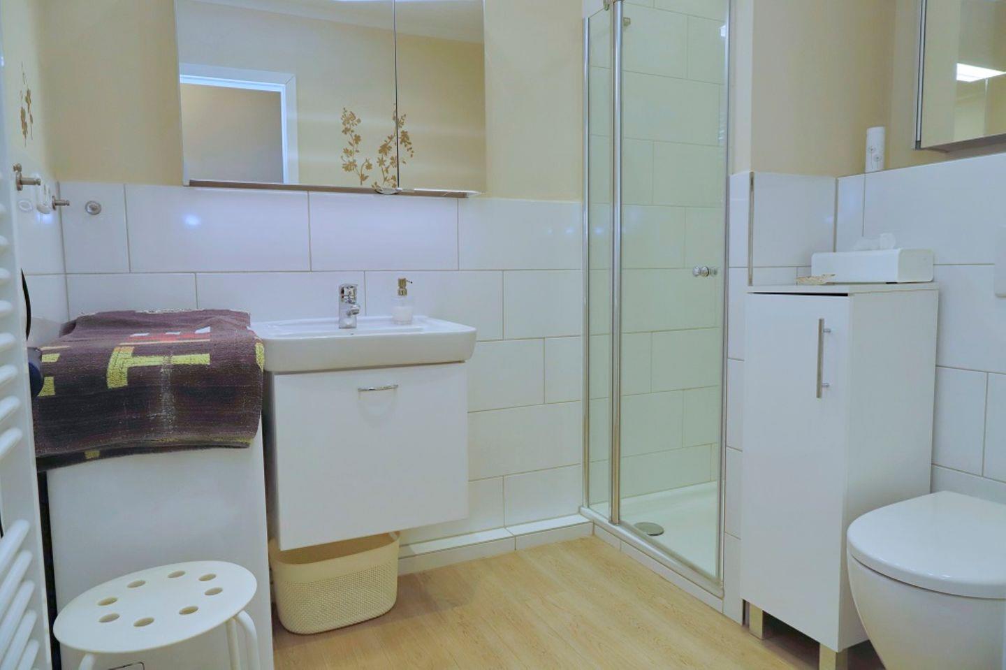 Von der Diele aus kommen Sie in das moderne Badezimmer mit Dusche und WC sowie in das separate Schlafzimmer mit einem Doppelbett und TV.