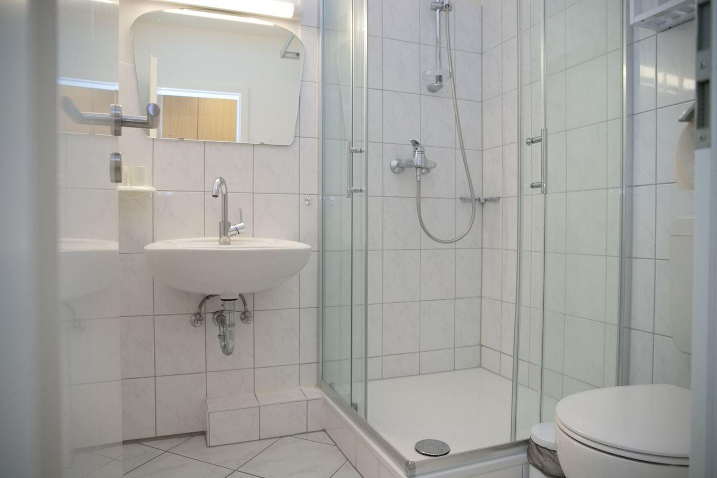 Das weiße Duschbad mit WC und Waschbecken komplettiert die Wohnung.